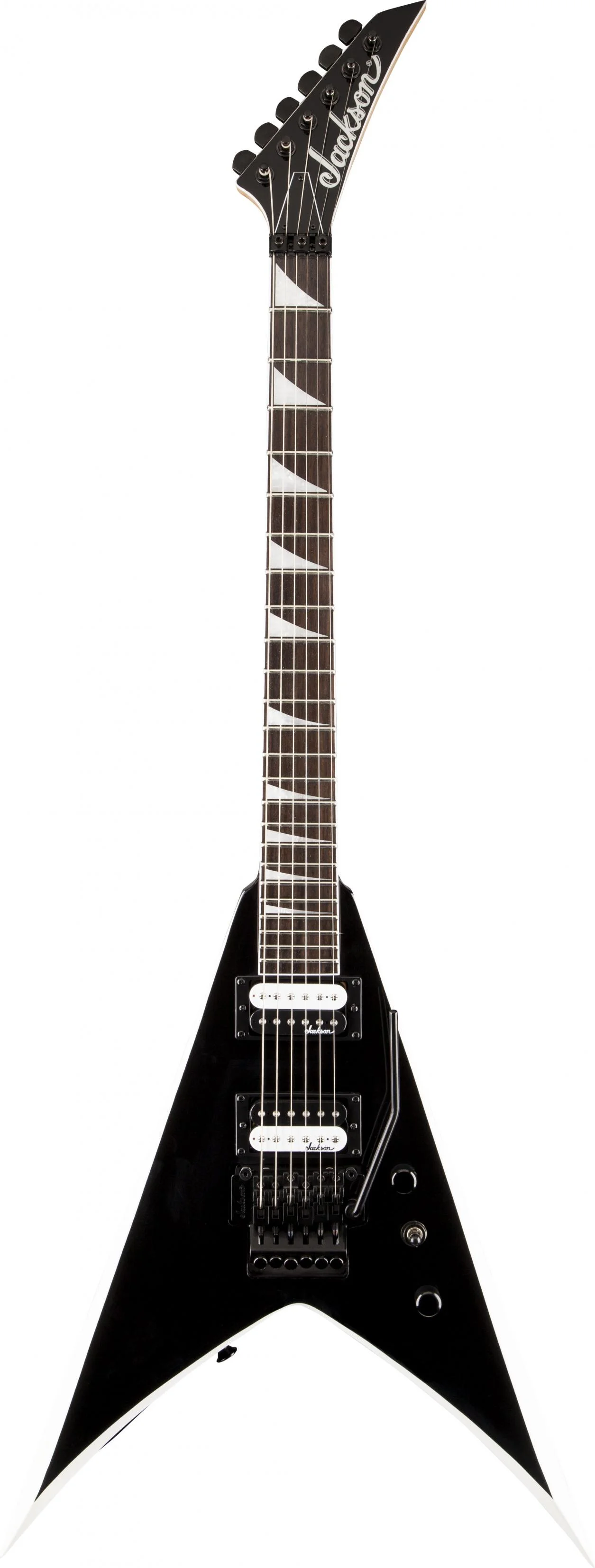 The regal JS32 King V with Floyd Rose has a basswood body and features a bolt-on maple speed neck with graphite reinforcement, dual high-output Jackson humbucking pickups with ceramic magnets and three-way toggle switching, Jackson-branded Floyd Rose double-locking tremolo bridge with black hardware and die-cast tuners. This model is offered in Black with White Bevels and White with Black Bevels.