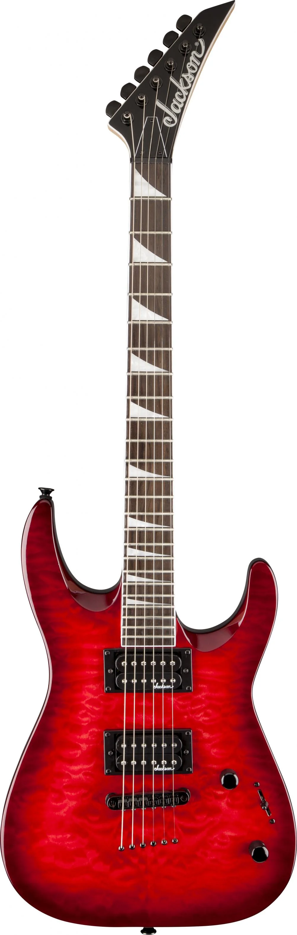 The JS32Q Dinky Arch Top, containing similar features to the JS32 Dinky Arch Top, has a bolt-on maple speed neck with graphite reinforcement, compound-radius (12-16) bound rosewood fingerboard with 24 jumbo frets and pearloid shark fin inlays, bound headstock, dual high-output Jackson humbucking pickups with ceramic magnets and three-way blade toggle switching, Jackson-branded Floyd Rose double-locking tremolo bridge with black hardware and die-cast tuners and is available with a beautiful quilt maple arched top in Trans Amber and Trans Black.