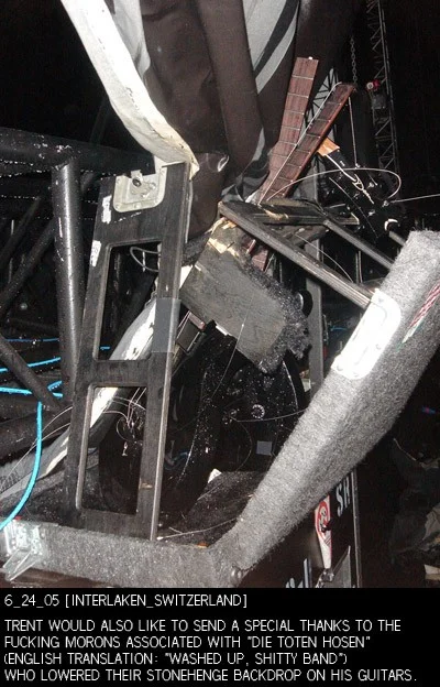 Dafür dass die Hosen die Gitarren zerstört haben gibt es überhaupt keine Beweise oder irgendwas ausser dieses Photo. Wennschon wären das wohl eher Crewmitglieder gewesen und nicht die Band selbst, und ganz sicher war es nicht Absicht.