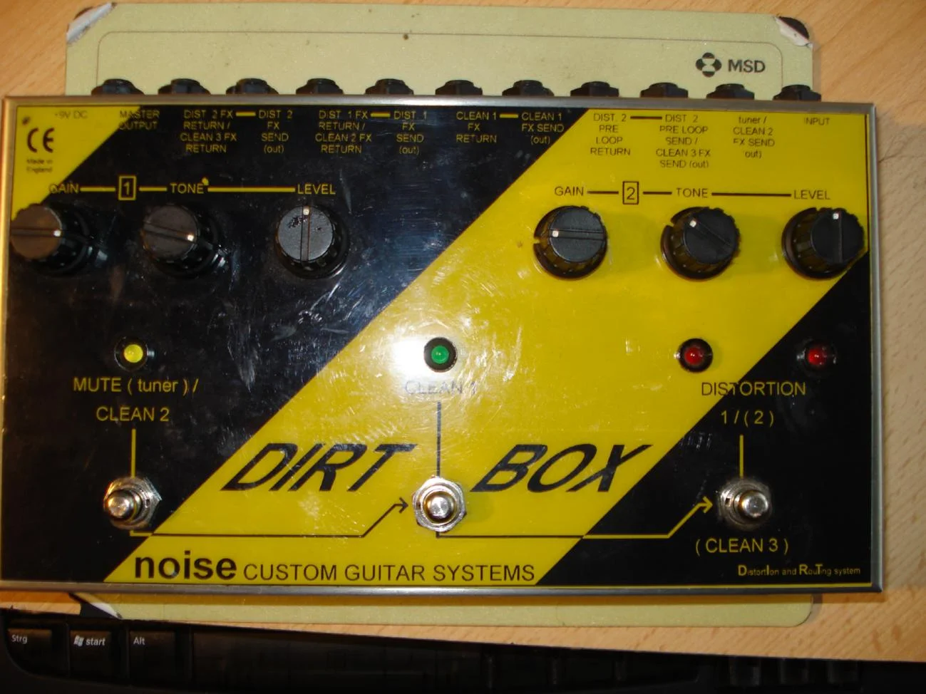 Es ist die DIRT BOX von Noise Custom Guitar Systems . Wie auf dem Bild unten zu sehen ist, hat es drei Kanäle, wobei ich bisher nur herausgefunden habe, dass der ganz linke das Signal komplett muted (also warum "CLEAN 2"????), CLEAN 1 das Pedal im Prtinzip ein und ausschaltet und man dann noch zwischen 2 verschiedenen Zerren wählen kann (DISTORTION 1/2). Außerdxem ist, soweit ich das überblicken kann, für jeden Kanal ein eigener FX Loop vorhanden.