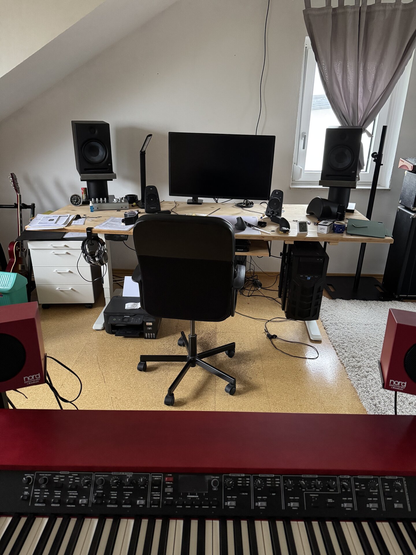 Momentan besitze ich ein Nord Grand, das ich über Presonus Eris E8 Studiomonitore spiele. Dabei stört mich allerdings, dass ich das Klavier rund zwei Meter vor dem Schreibtisch platzieren muss, um einen guten Klang zu haben bzw. im Stereodreieck zwischen den Monitoren zu sitzen.