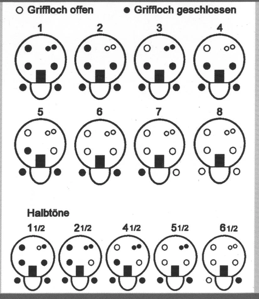 Die tiefe 7 entsteht durch Reduzieren des Blasdrucks, alle anderen durch verschiedene Griffkombinationen.