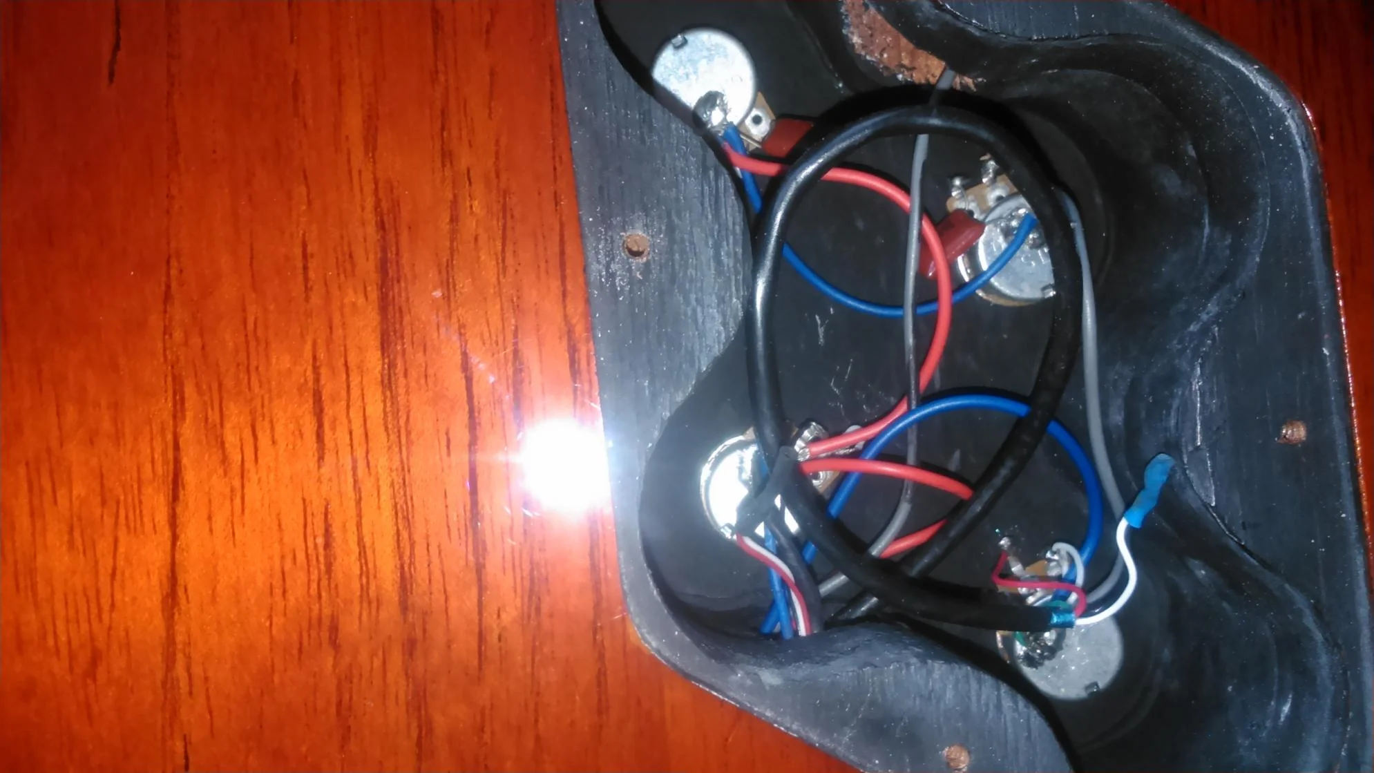 Ich habe dann mal die Klappe hinten geöffnet und ein Foto von den verbauten Orange Drops gemacht. Diese sind an den Tone-Potis verbaut:
