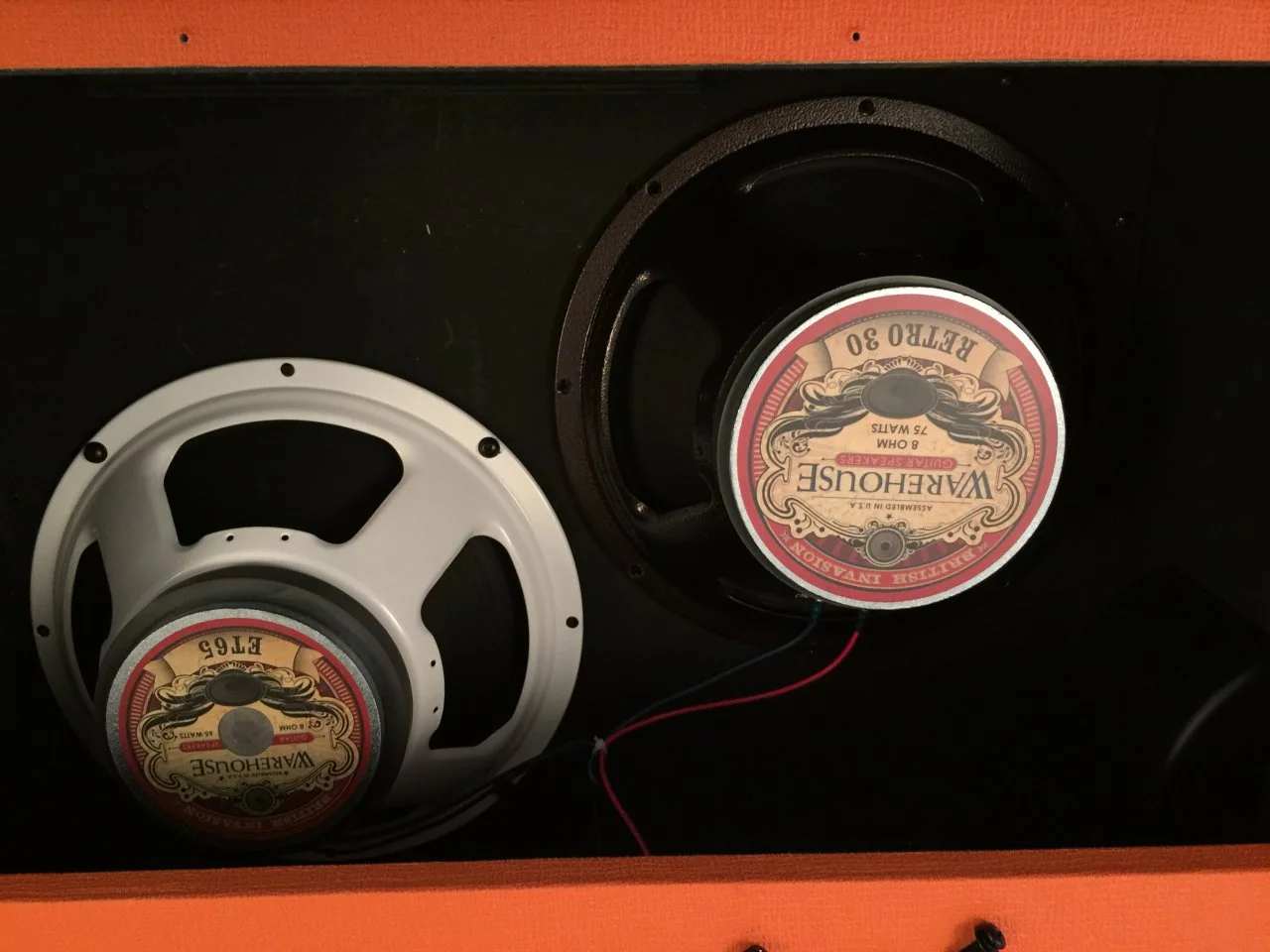 Bei allen meinen Boxen flogen die Celestion V30 Speaker raus und wurden durch die -meiner Meinung nach - besseren WGS Speaker ersetzt.Hier geht es aber um die halboffene Orange PPC212 COB Box, aus der ich schon seit längerem eine Geschlossene machen wollte. Ich war mir nicht sicher, ob sich das klanglich zum Guten wendet. Der Hersteller wird sich bei der Konstruktion sicher etwas dabei gedacht haben. Hinzu kommt noch, dass die geschlossene Orange Box in Breite und Höhe zwar identisch ist, aber in der Tiefe ganze 8cm mehr misst. Sie ist also um einiges voluminöser.