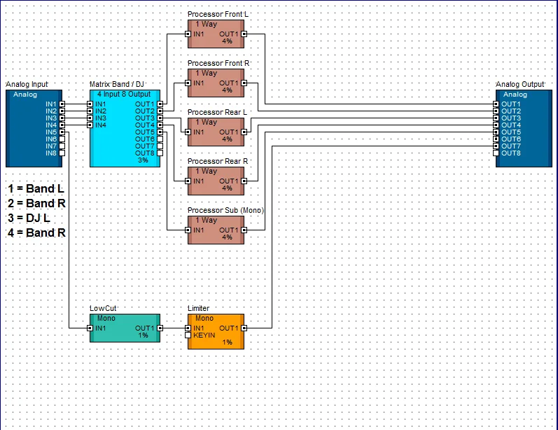 Einmal soll das System so konfiuriert werden, dass bei Live-Musik aus der 4-Punkt-Beschallung eine normale Stereo-Aufstellung wird. Dank einfacher Matrix alles kein Problem. Auch der Rest wäre an sich kein Problem, wenn es sich um ein einfaches Speaker-Management handeln würde. Aber beim DME24N gibt es unmölich viele Möglichkeiten. Mein Problem ist also der Luxus, dne dieses Gerät bietet.
