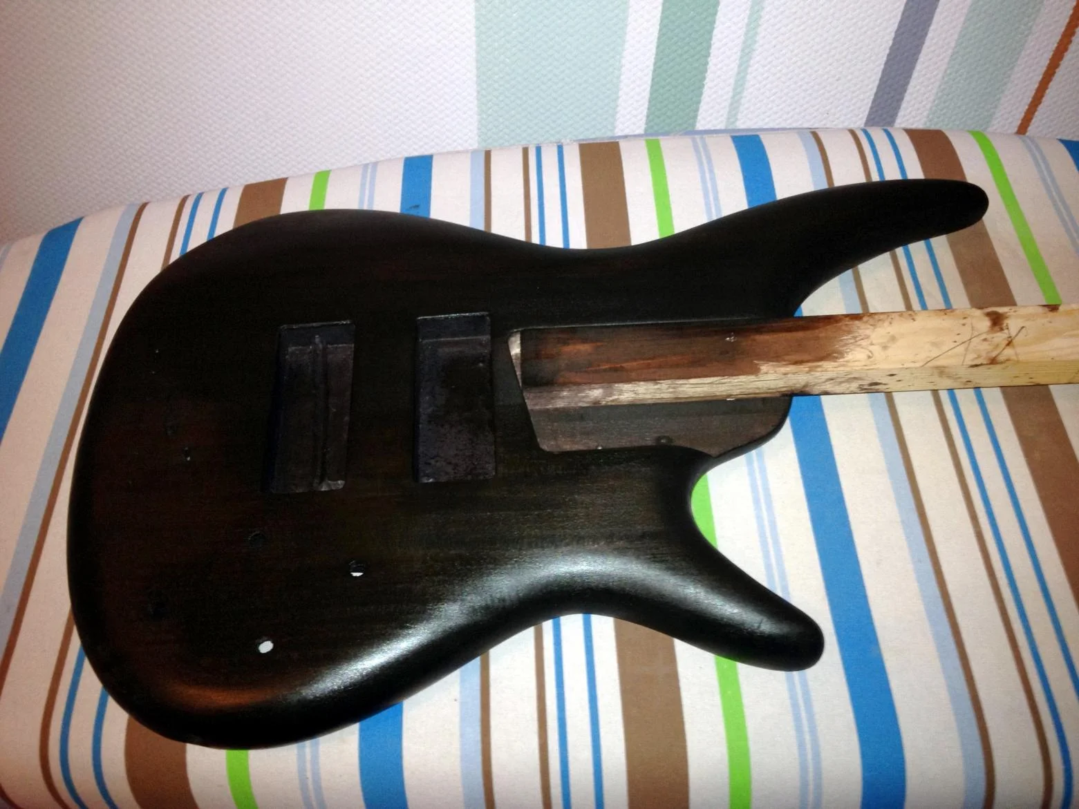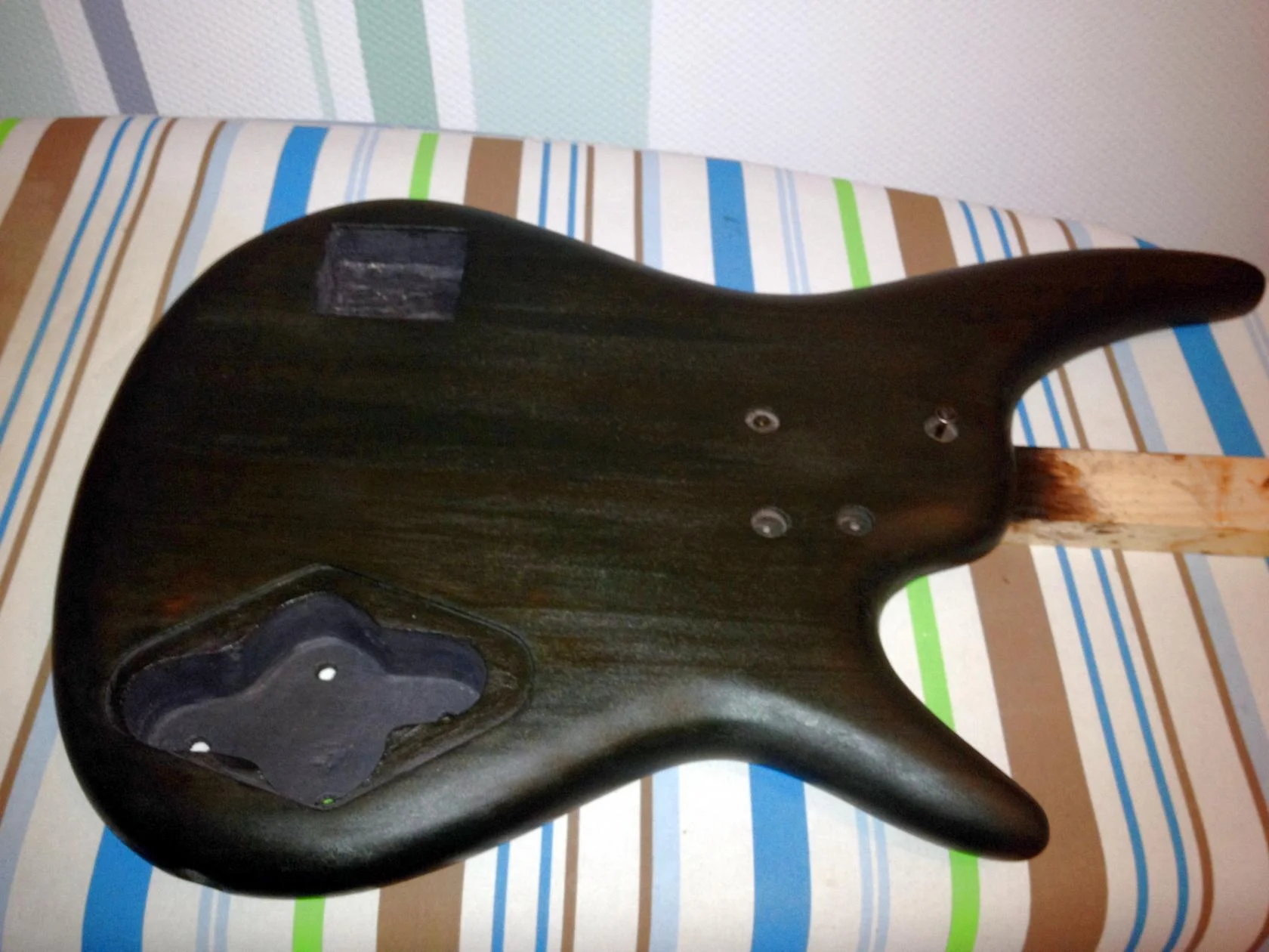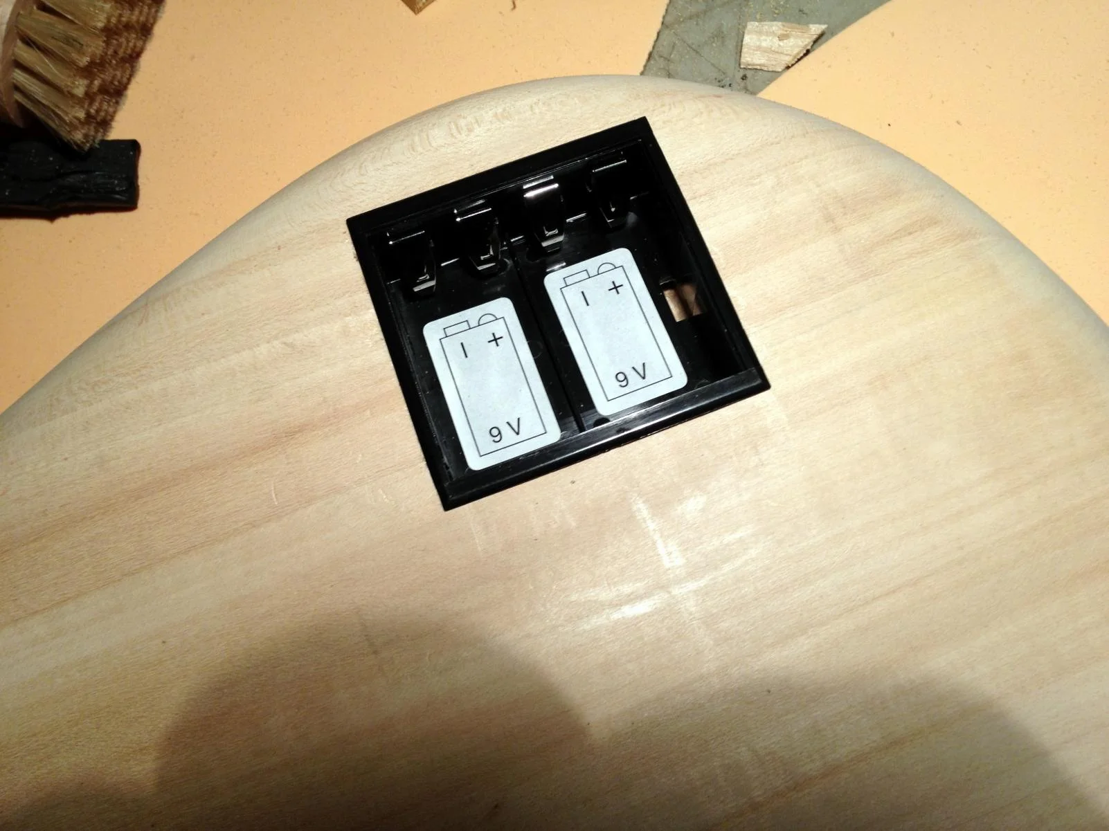 Nachdem alles raus war, wurde noch schnell ein Loch, von der Batteriefach Aussparung zum Steg Pickup gebohrt, um die Kabel der Stromversorgung, letztendlich unter den Pickup´s weg zuführen. Da es ja schon eine Bohrung zwischen der Steg Pickup Aussparung und dem Elektrofach gab, gelangten so die Kabel ganz Elegand ins Elektrofach....also, auf den nächsten Bildern sieht man die doppelte Batterieaufnahme und die Kabel sind Rückseitig bereits verlötet...
