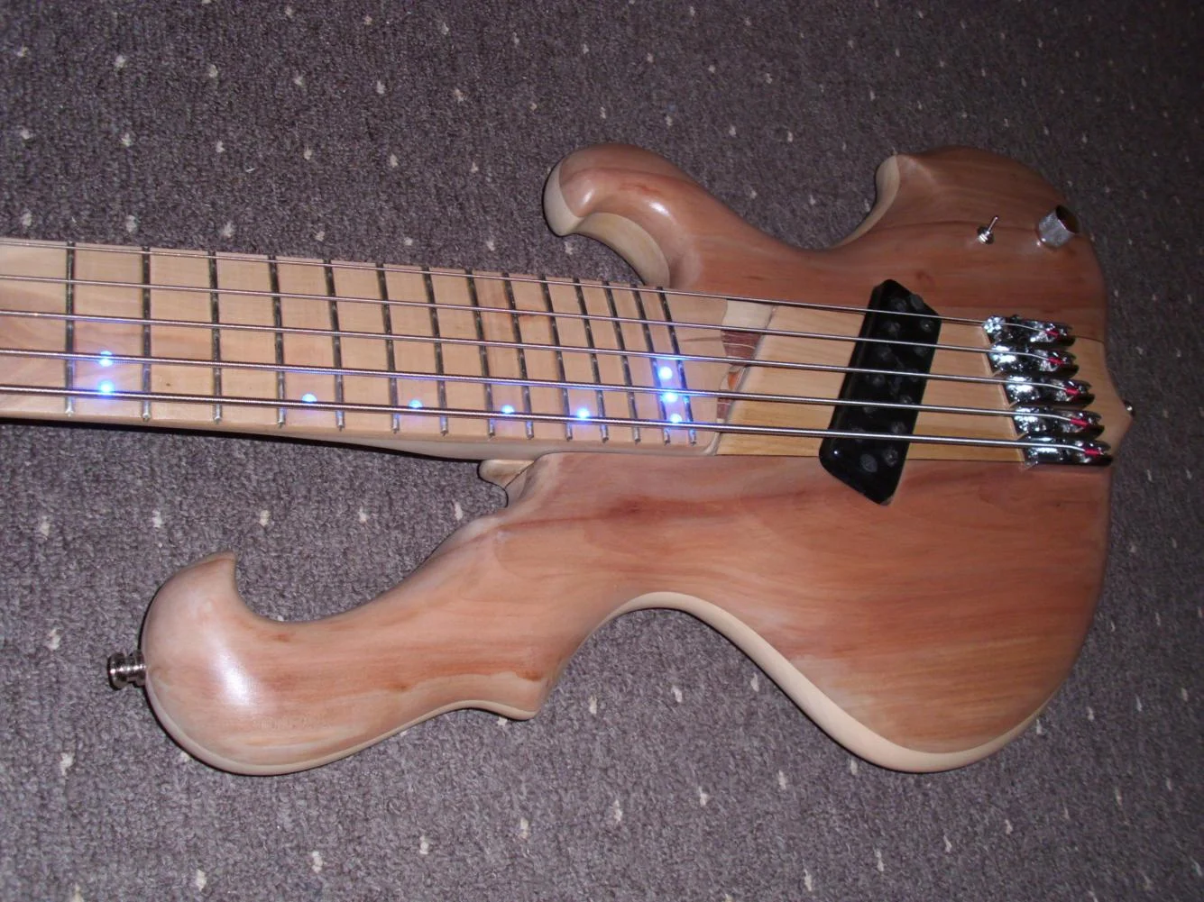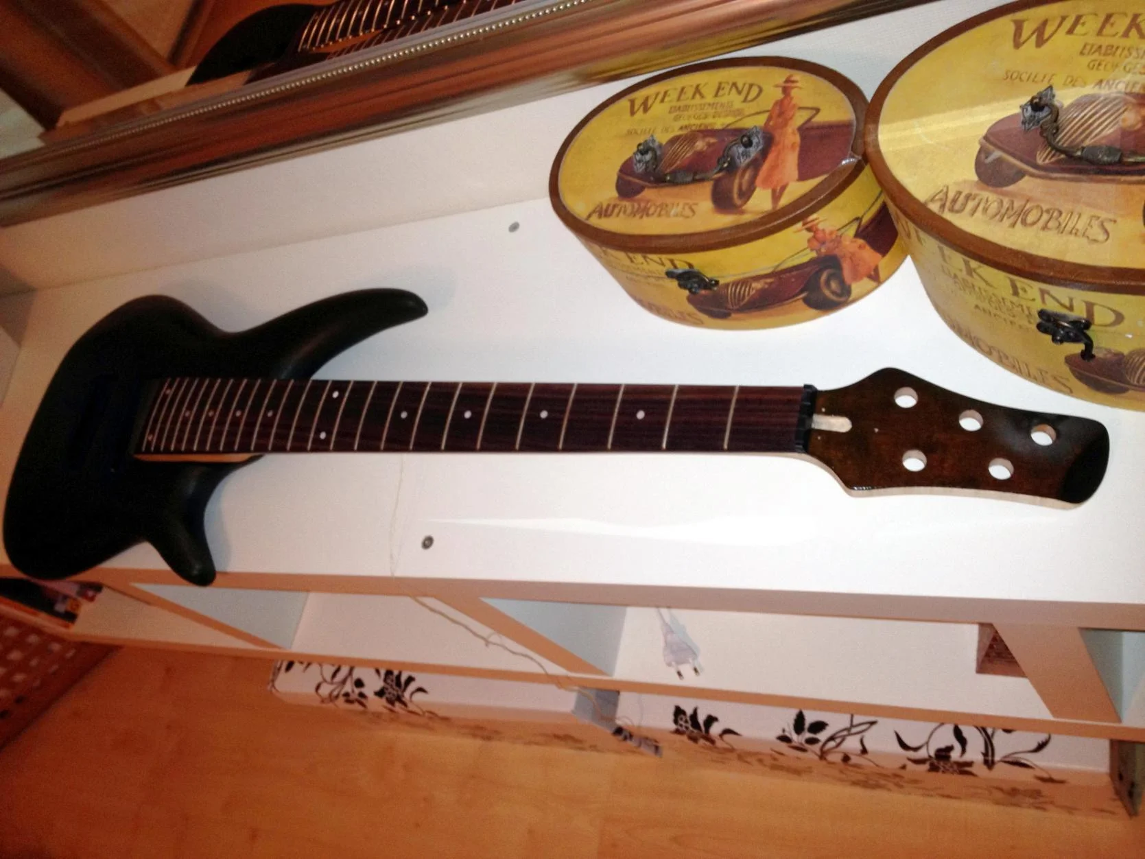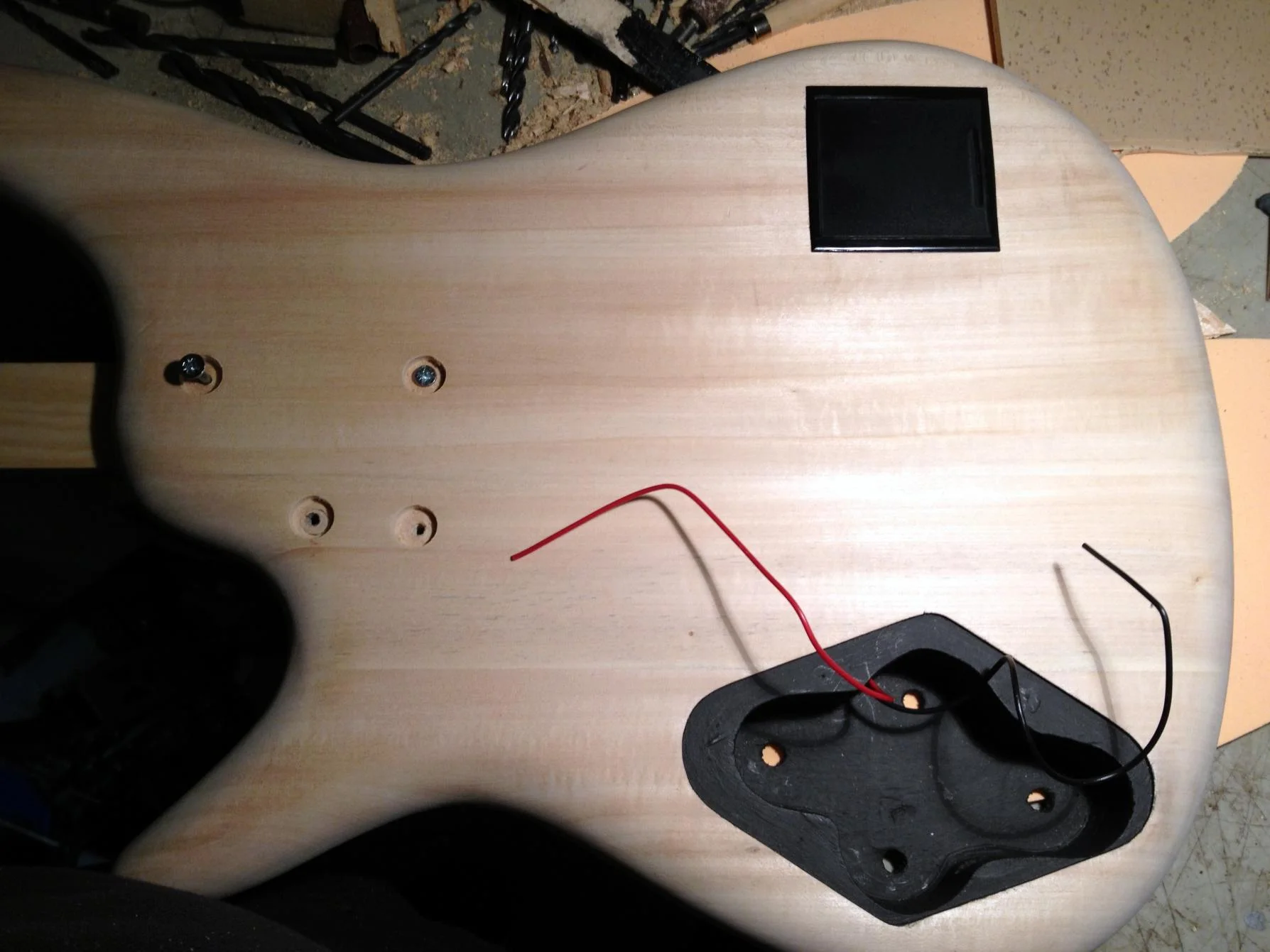 Nachdem alles raus war, wurde noch schnell ein Loch, von der Batteriefach Aussparung zum Steg Pickup gebohrt, um die Kabel der Stromversorgung, letztendlich unter den Pickup´s weg zuführen. Da es ja schon eine Bohrung zwischen der Steg Pickup Aussparung und dem Elektrofach gab, gelangten so die Kabel ganz Elegand ins Elektrofach....also, auf den nächsten Bildern sieht man die doppelte Batterieaufnahme und die Kabel sind Rückseitig bereits verlötet...