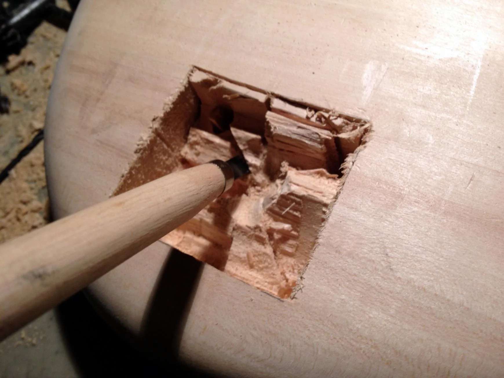 Erst wurden ca. 2,5cm tiefe Bohrungen, eben so tief wie das Batteriefach ist, in allen vier Ecken gebohrt. Der Bohrer selber hatte einen Durchmesser von 10mm. Mehr schaft das Bohrfutter meines Akkuschraubers nicht. Nach den Bohrungen bin ich mit der Stichsäge von Ecke zu Ecke gegangen um einen saubern schnitt für mein Kästchen zu bekommen. Da Erle gut Spaltbar ist, war´s jetzt auch wirklich kein Problem mit nem ordinären Flachschlitzschraubendreher und nem leichteren Hammer, einzelne Frakmente aus dem Holz zu lösen s. auch nächstes Bild)