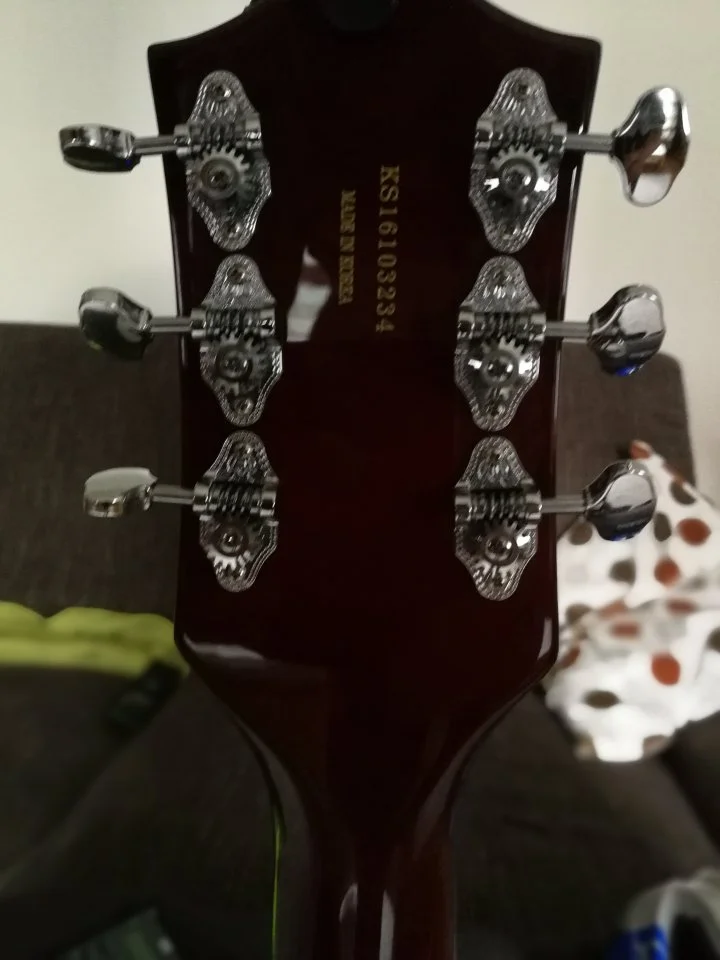 In letzter Zeit montieren die fleißigen Arbeiter in Korea auf die Gretchen oft so chinesische offene Mechaniken mit Butterbean-Knöppen, die mit je zwei Schrauben befestigt werden. Denen sieht man ihre mindere Qualität zwar direkt an, aber trotzdem tippe ich auf den Sattel.