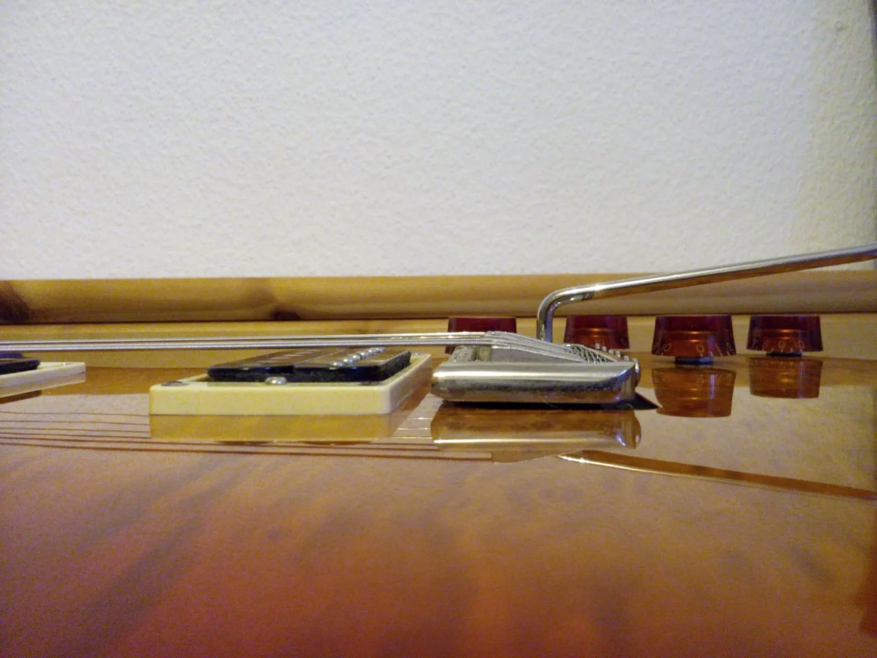 Okay, also Kleber in vernünftigem Maße auf die notwendigen Stellen an der Gitarre auftragen und den Sattel fixieren. Hier bitte sehr genau arbeiten (an den beiden Enden fühlen, ob sie jeweils mit dem Gitarrenhals abschließen).