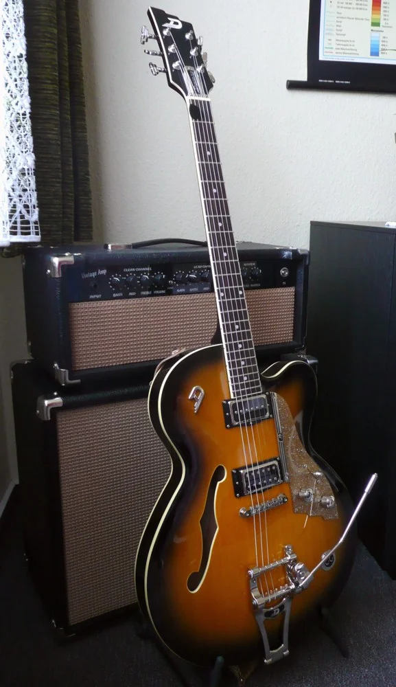 Das Cab ist mit einem Jensen P10R und einem P10Q bestückt. Jensen Neos probiere ich evtl. später auch mal aus, aber der Klang ist jetzt schon super. Man sollte aber darauf achten, dass man in größeren Räumlichkeiten spielt, ansonsten können sich die Speaker nicht so gut entfalten. Sonst gilt halt - je lauter, je besser, Amp, wie auch Speaker danken´s mit deutlich mehr Dynamik und sehr gutem Sound - clean, wie verzerrt. Verzerrt ist in der Combi mit der Carl Carlton eher das Metier des Bridge-Humbuckers, clean glänzt der Domino am Neck. Der Cleanklang ist verdammt brillant, da hat PCL sich nicht lumpen lassen.