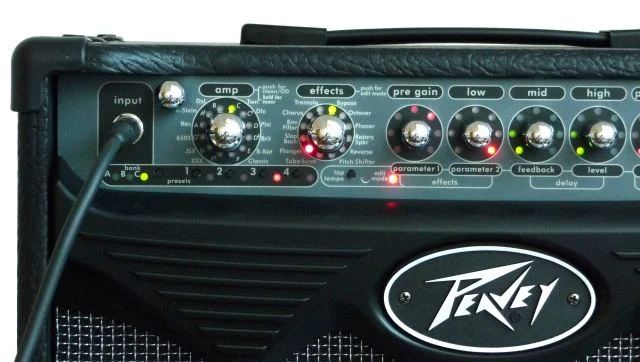 Red LEDs in Effects indicate selected stompbox effect.