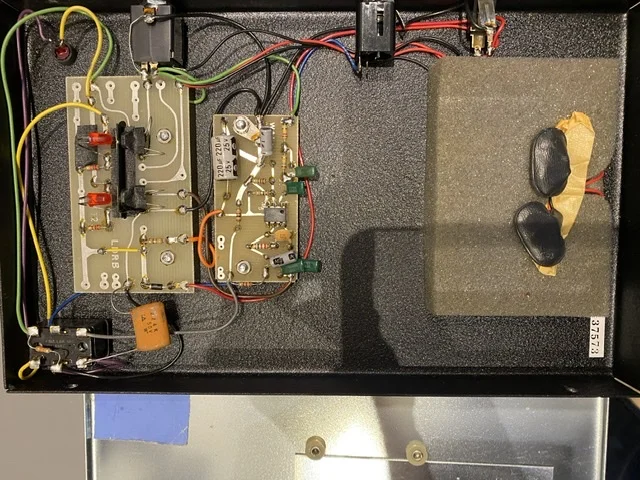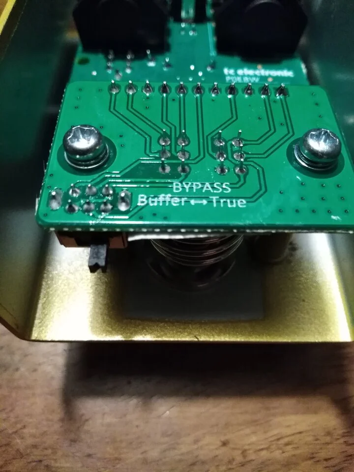 Wie man auf diesem Bild sehen kann, läßt sich das Pedal zwischen Buffered Bypass und True Bypass im Inneren umstellen.