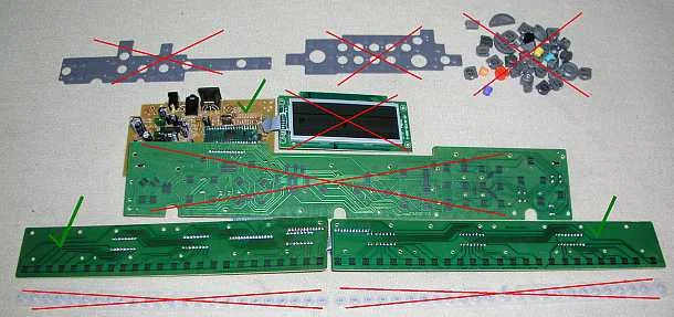 Da es sich bei den Tasten (und auch den Bedienknöpfen) um im Ruhezustand geöffnete Schalter handelt, lassen sich bei Nichtbedarf die kompletten Platinen entfernen, ohne daß die "Zentralelektronik" einen Unterschied merkt. Die Taster lassen sich dann natürlich nur nicht mehr drücken aber das wollen wir ja auch nicht