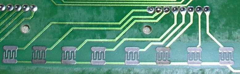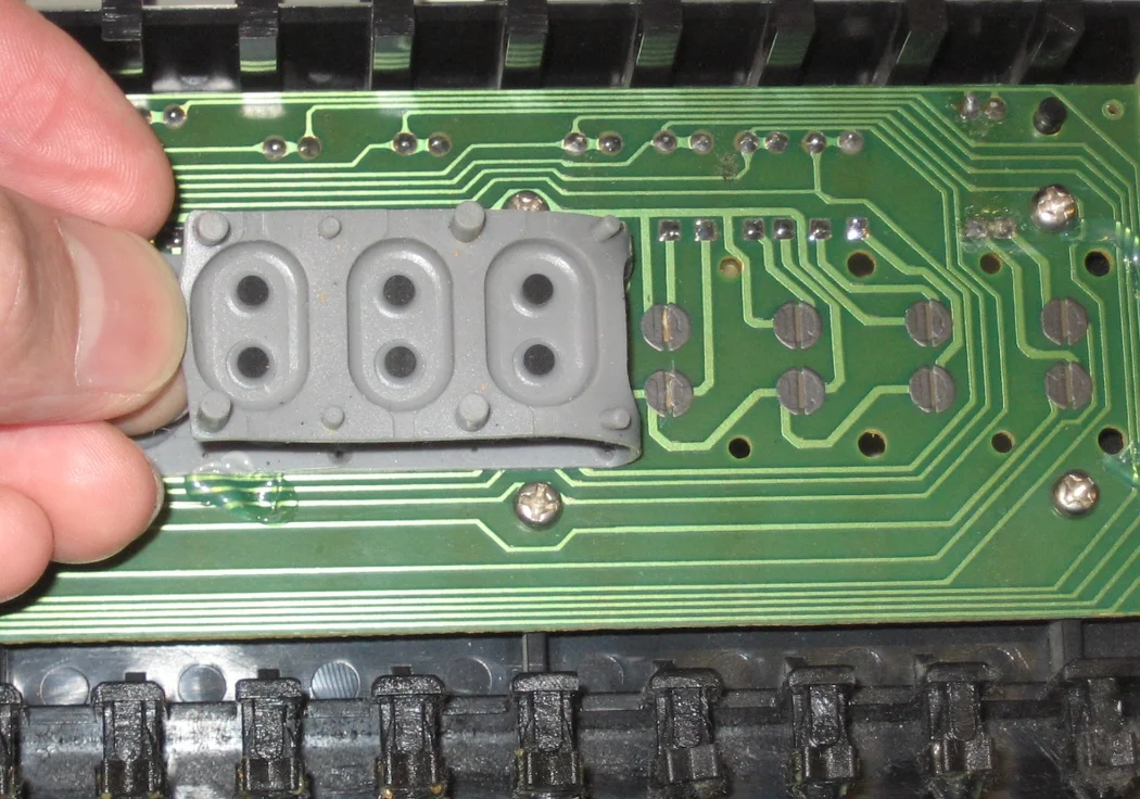 Die Tastenkontakte bestehen aus aufgedruckten ineinandergreifenden "Kämmen", die durch Graphikstückchen in der operativ entfernten Gummimatten überbrückt werden können.