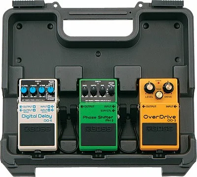 Unter die rechte und linke Seite der Platte werde ich meine 3 Danelectro FAB Pedale einbauen (die Platinen sind recht winzig), ohne ihre Gehäuse natürlich. In die mitte unter den Griff kommt ein Fußschalter für den DS-2 (Turbo Mode) und je eine Buchse für Gitarre in, Amp out und Strom in.