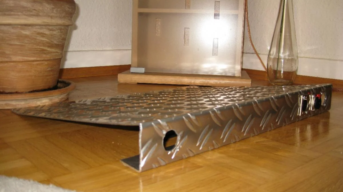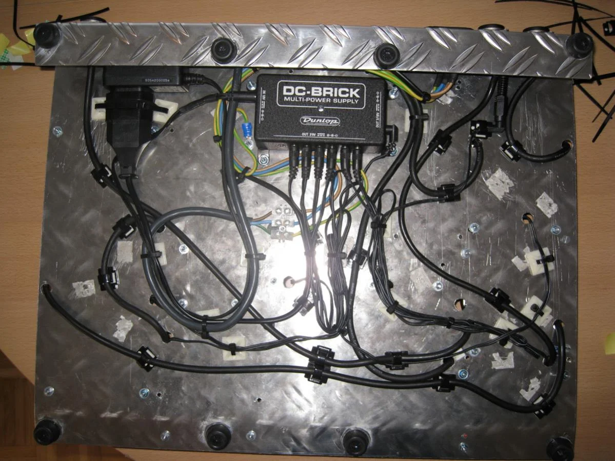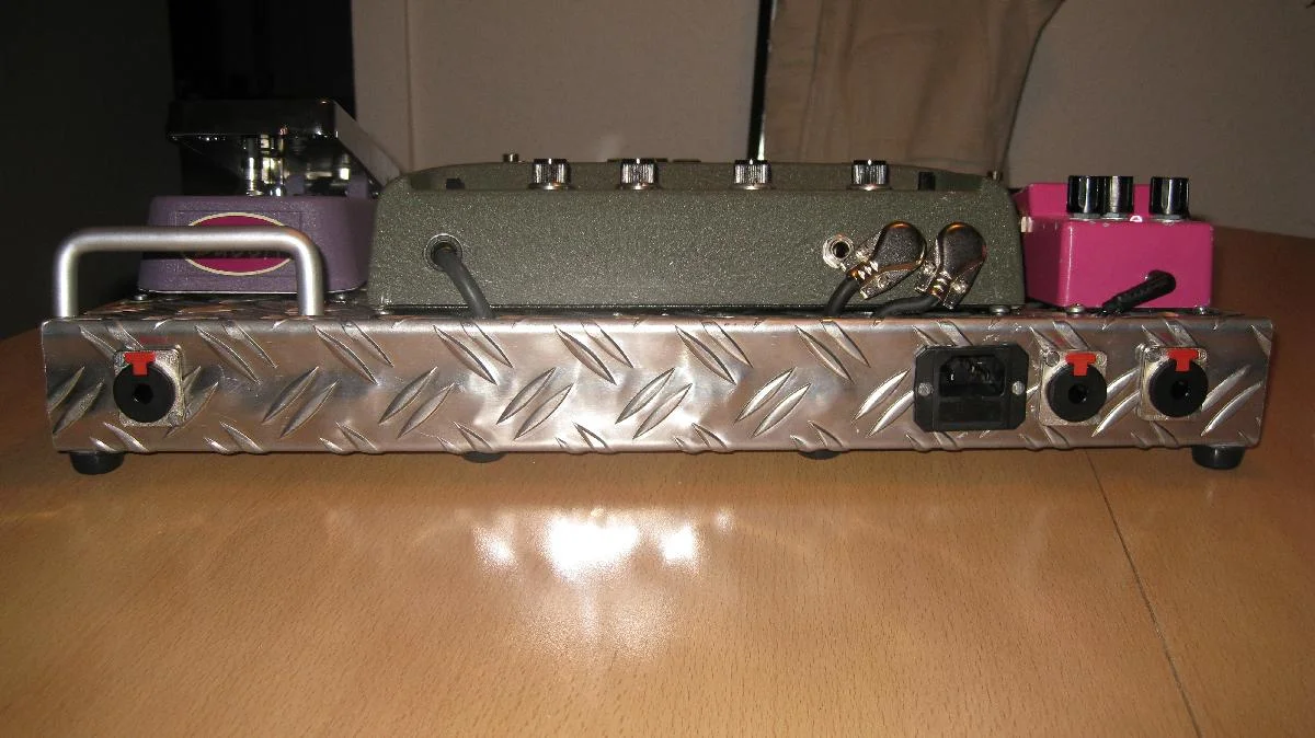 Eventuell lasse ich mir die Edelstahlplatte über die ganze Fläche machen, also auch um die Pedale herum, so kann ich die Kabel zu den Buchsen für in und out noch etwas "verstecken". Muß ich mir aber auch erst noch genauer anschauen.