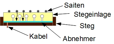 Die gängigste Montageart bei Originalausrüstern ist die Montage unter der Stegeinlage. Verwendet werden Piezo- Transducerelemente, die in den Schlitz passen. Eventuell muss der Steg um die Dicke des Wandlers flacher gefeilt werden, damit sich die Saitenlage nicht verändert.
