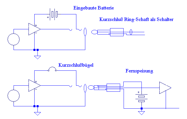 Manche Verstärker haben auch eine eingebaute Fernspeisung (z.B.AER), die leider oft fälschlicherweise als 9V Phantomspeisung bezeichnet wird. Die funktioniert dann auch wie beschrieben.