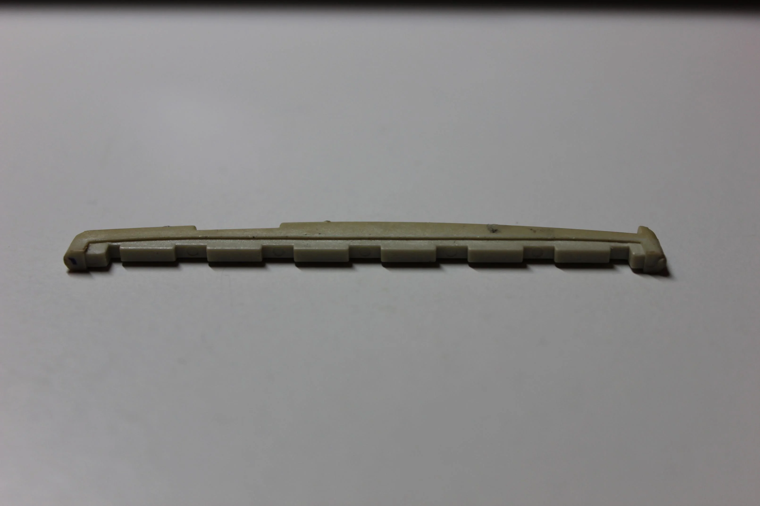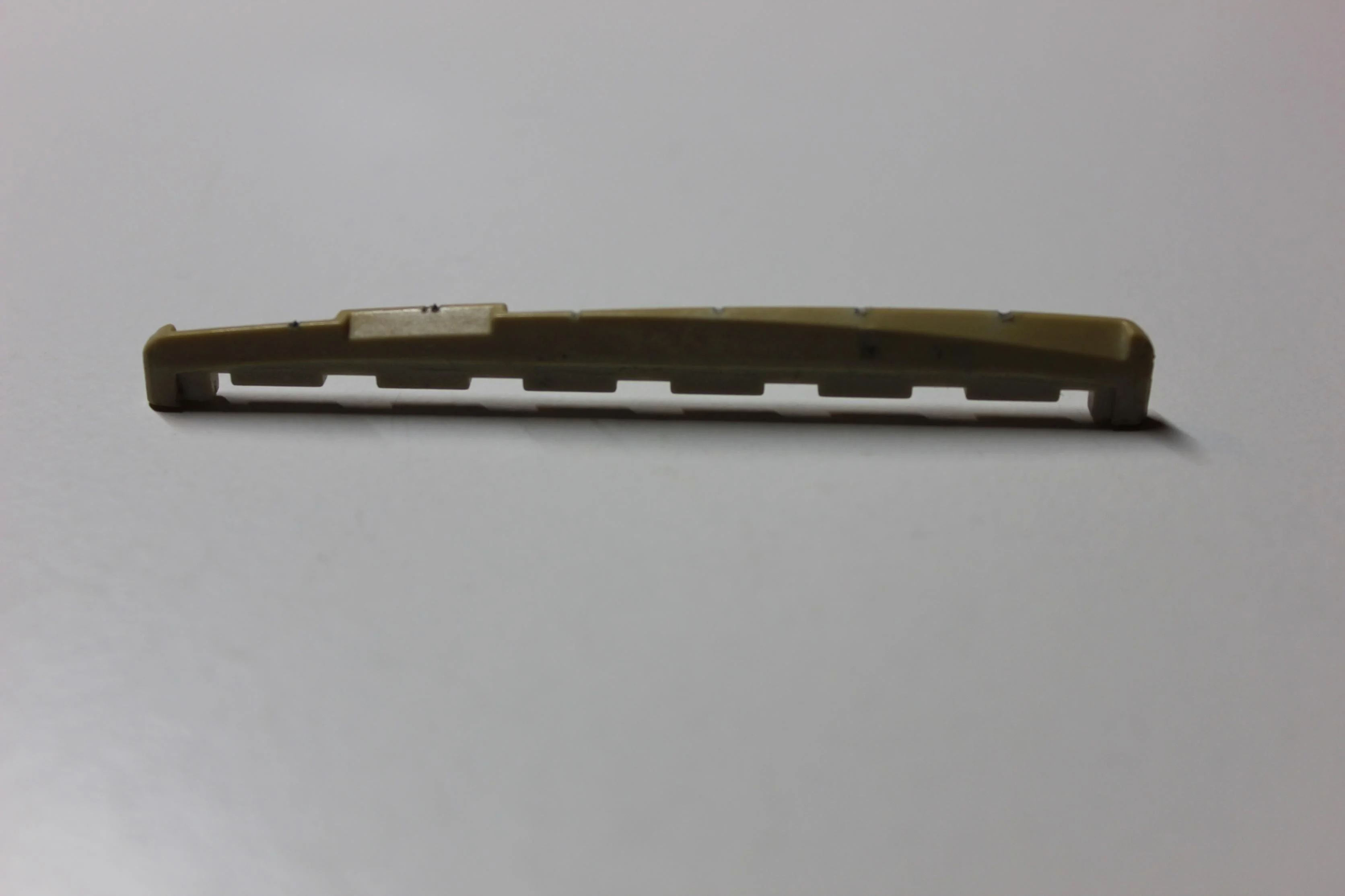 Nun ist ein häufiger Tipp im Internet, die Unterseite der - in meinem Fall - Kunststoffstegeinlage gleichmäßig abzufeilen, da so der besondere "Schliff" an der Oberseite, der die Bundreinheit sicherstellt, nicht verändert wird. Das ist mir auch wichtig.