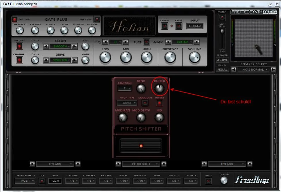 Ich versuch mich grad son bisschen an Wintersun und will auch gerne "Land of Snow and Sorrow" spielen. Weil ich aber keine große Lust hab, immer zwischen Drop-C und Drop-Bb zu wechseln, wollte ich das machen, wie die Jungs auch: Einfach mit nem Pitch Shifter 2 Halbtöne nach unten drücken. Funktioniert an sich ganz gut, aber nun der Haken: Das würfelt mir meinen Input durcheinander. Manche Töne höre ich dann doppelt und das ist noch verwirrender, als wenn man die Saiten nen Ganzton höher hört zu dem, was ausm Kopfhöher dröhnt...