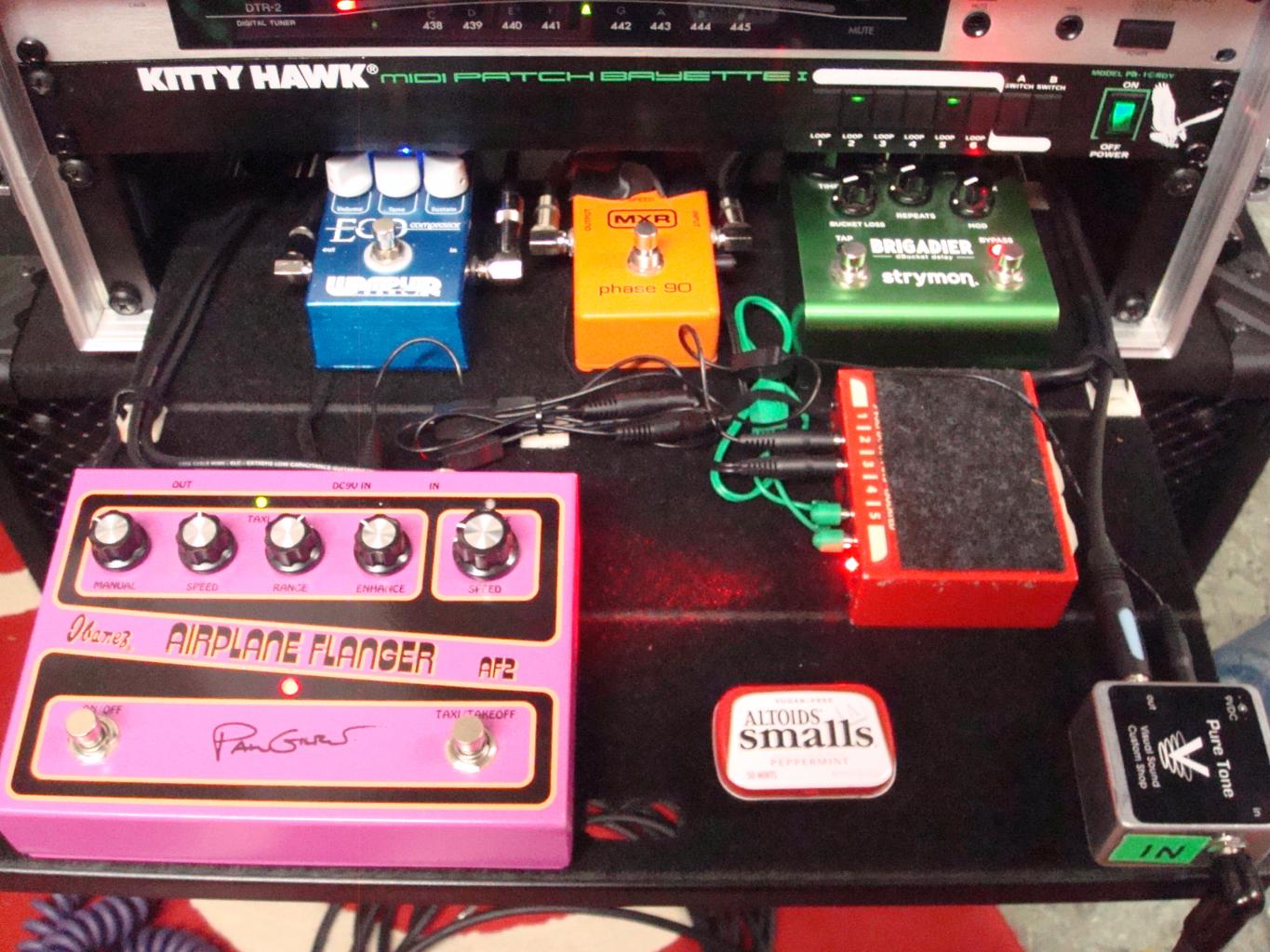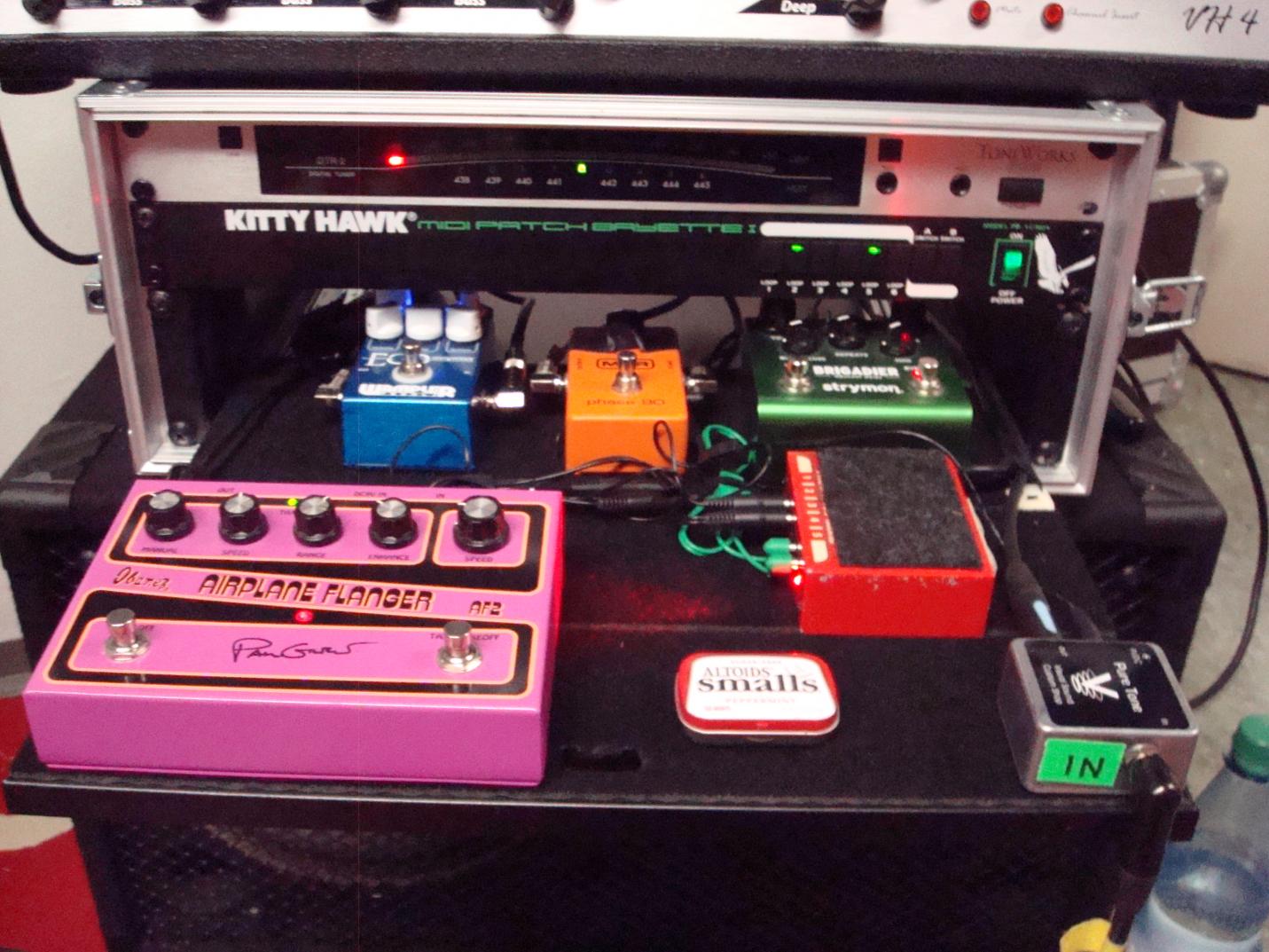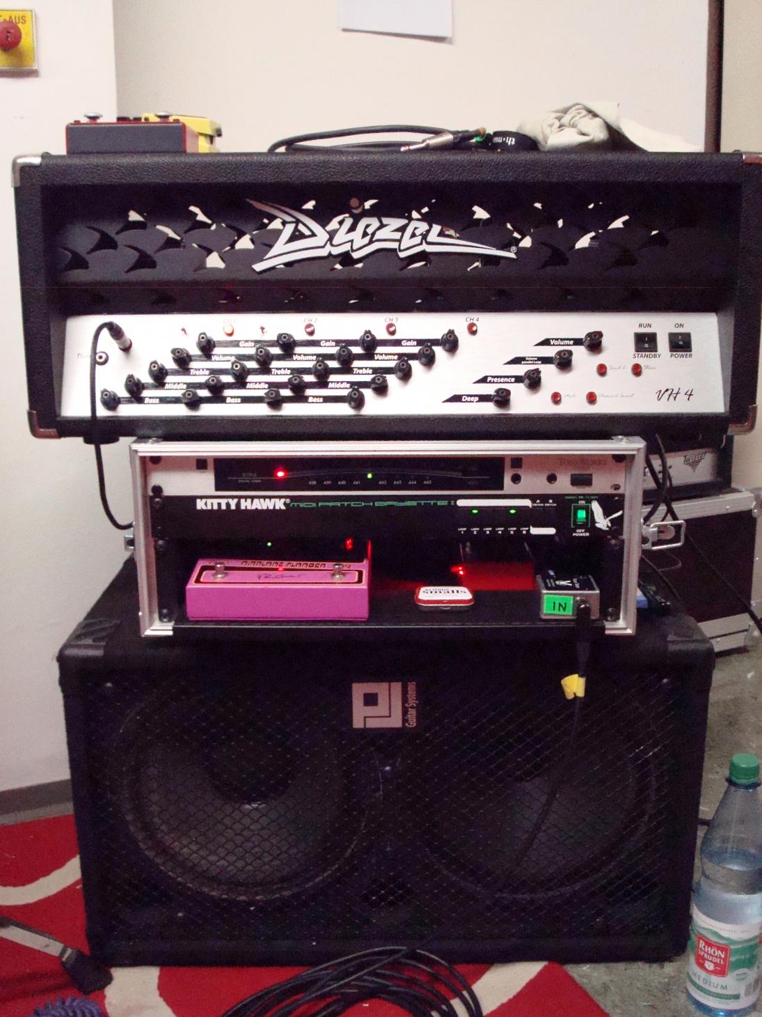 Gitarre -> Visual Sound Buffer -> Kitty Hawk MIDI Patch Bayette [Loop 2: Phase 90][Loop 5: AF2][Loop 6: Ego Comp] -> Diezel VH4 [CH4 Insert: Strymon Brigadier] -> Guitarsystems ClubCab (V30+T75)