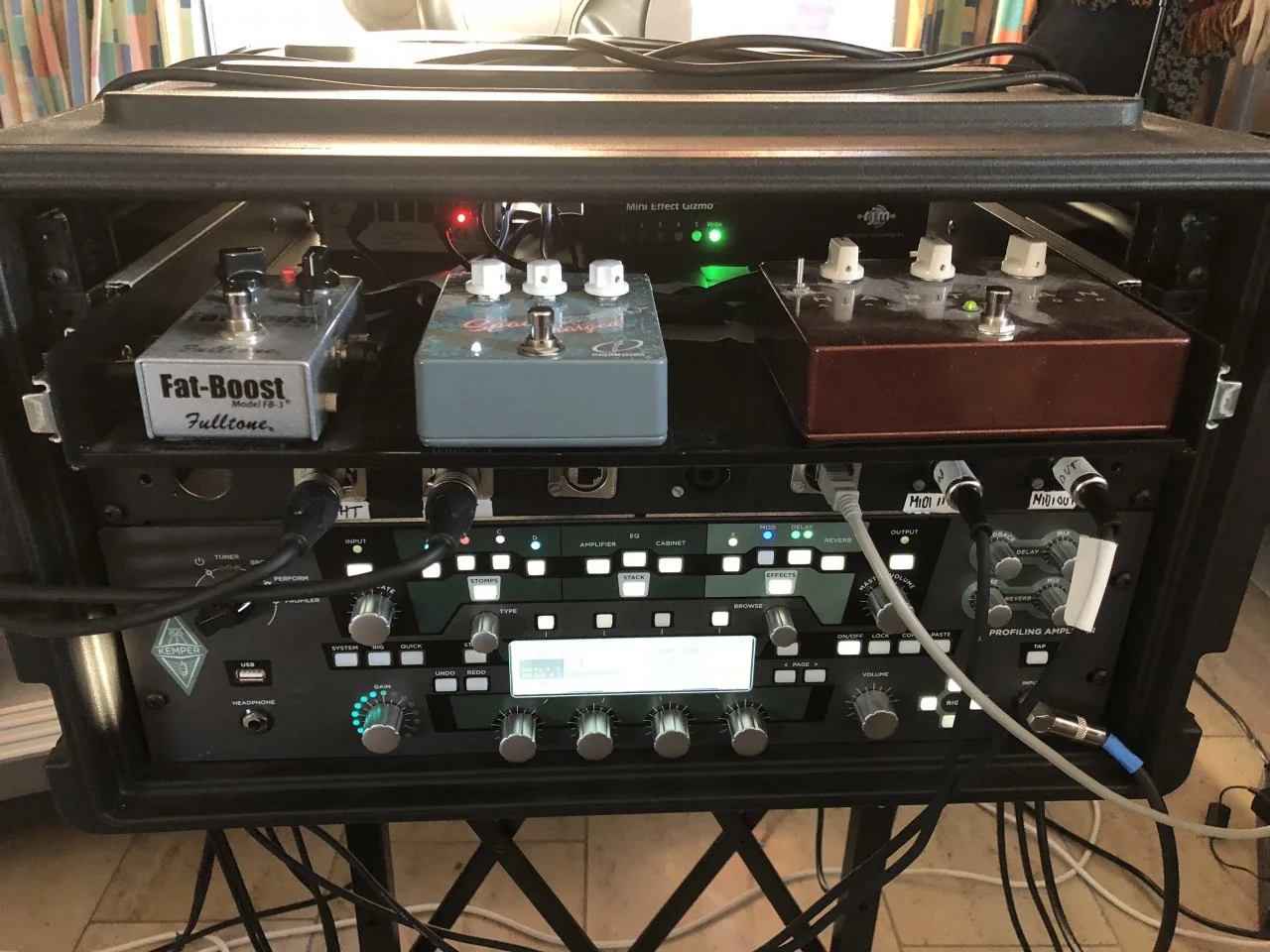 Und irgendwie fand ich meinen Sound trotzdem geil ... Da bastelt man ewig an seinen Sounds rum und live auf der Bühne geht es eh nur ums Überleben ... Endstufe in ein 3HE-Case und Preamp + Intellifex in ein 3HE-Case. Das wäre natürlich super-schlank. Aber wenn ich es so tue, schraub ich in einem halben Jahr wieder rum! Grrrrrr! Warum kann ich da nicht einfach mal einen Haken dran machen!