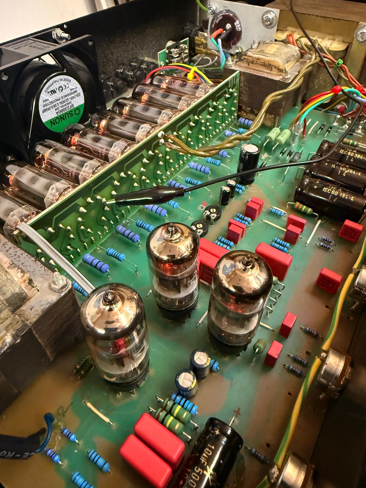 Der Rockman Patchmate 8 wird die Effektsektion kontrollieren, bestehend aus einem Rocktron PRO Q, einem genialen parametrischen EQ, und einem Strymon Dreigestirn bestehnd aus Mobius, TimeLine und BigSky wobei die beiden erstgenannten noch nicht bei mir sind. Die 9V Stromversorgung übernimmt eine G-LAB Power Box. zum Schluß kommt nach dem BBE Sonic Maximizer kommt die Mesa Boogie 2x20 Watt EL84 Endstufe. Boxen werden zwei JCM800 1936 2x12 Boxen sein.