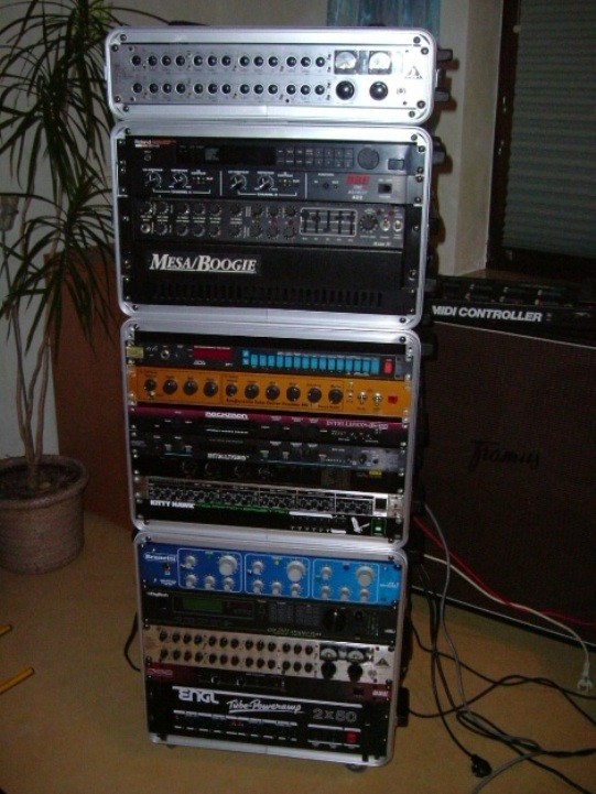 für den Brunetti Amp habe ich noch ein 2 he Rack mit nem BBE Sonic Maximizer 482i und nem Rocktron Replifex, muss noch eingebaut werden.In den Racks sind unteranderem noch Nobels Splitter, Nobels MS-4 Midi Switcher, Nobels AB Switcher, ein Behringer Micro Mix (damit kann man z.b. 2 Preamps mischen!)..