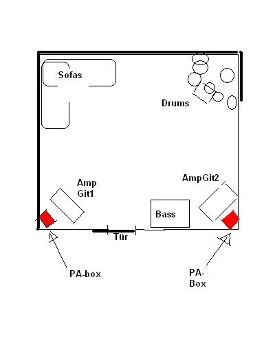Folgendes: unser proberaum is ca 25m² groß, die Wände aus rigips. Um das bild zu beschreiben, was da unten folgt: die roten dinger stellen die boxen dar, über die unser Schlagzeuger seine Bassdrum triggert, und über die die vokals kommen. diese stehen soweit erhöht, dass sie über die davorstehende git-boxen (4x12) hinausragen. die dickmarkierten linien stellen eine Scfhaumstoffabdeckung über die wand getackert dar, so schwarzer noppenstoff. dieser ist ca.2-3 cm breit, plus den noppen (dürfte nochmal so sein).