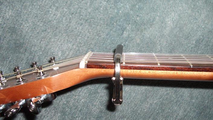 Das nächste Problem ist die unterschiedliche Dicke der Spielsaiten zu den Oktavsaiten. Die dicke E-Saite ist ca. 1,1mm dick und die zugehörige Oktavsaite ca. 0,65. Wenn das Kapo die Spielsaite schon fixiert, ist (übertrieben gesagt) die Oktavsaite noch relativ lose.