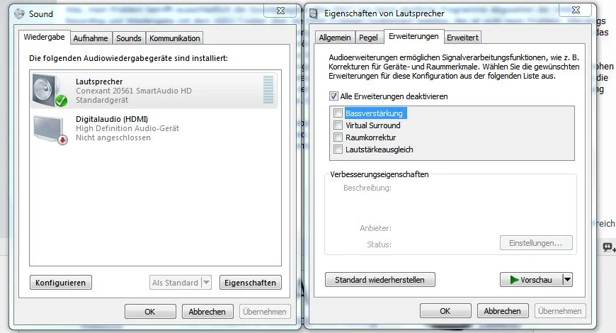 Kann man in WIN7 irgendwo verschiedene Treiber z.B. Asio zur Standartwiedergabe verwenden/auswählen - mir ist da über den Gerätemanager und den Soundseinstellungen in der Systemsteuerung nichts bekannt? (mit ASIO über die DAW gehts ja super)