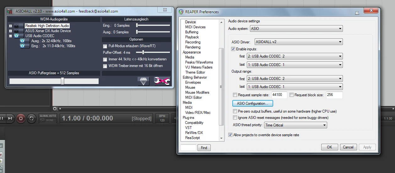 ich habe zurzeit ein kleines Problem was das recorden angeht. Und zwar habe ich mir vor kurzem ein USB-Interface (Behringer UCG102) zugelegt um mal ein bisschen was aufzunehmen. Soweit so gut, aber das Problem ist die Latenzzeit (46ms über WaveOut) für meinen Zweck viel zu hoch. Um die Latenzzeit zu verringern habe ich mir den ASIO4ALL-Treiber geholt und in mein DAW-Programm (Reaper) gewurschtelt, ich hatte und habe keinen Ahnung wie man ASIO in diesem Fall gescheit konfiguriert. Als erstes hatte ich keinen Output, obwohl ich das im ASIO-Menü eig. richtig ausgewählt hatte, nach etwas Rumprobiererei (habe einfach die Buffergröße auf 512 gestellt) hatte ich doch immerhin kurze "zuckungen" die aber wie gesagt nur immer ein kurzes "Kratzen" darstellen. Ich versteh einfach nicht so recht was ich falsch mache, ich hab schon Leute gesehen die haben das mit einem Netbook nach dem selben Prinzip gemacht, und hatten eine Latenzzeit von unter 10ms und ne gescheite Quali. Ich hoffe ihr könnt mir helfen ASIO einigermaßen gut zu konfigurieren. 🙂