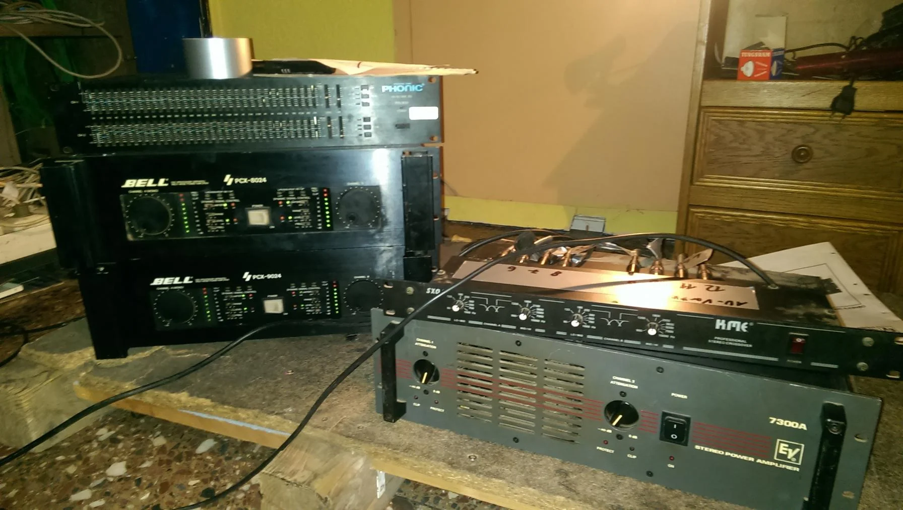 Es handelt sich um einen Phonic Equalizer PEQ 3600, Eine Endstufe BELL 8024, Eine Endstufe BELL 9024, Einem Stereo Power Amplifier von EV und einem Stereo Crossover SXO 3 von KME.