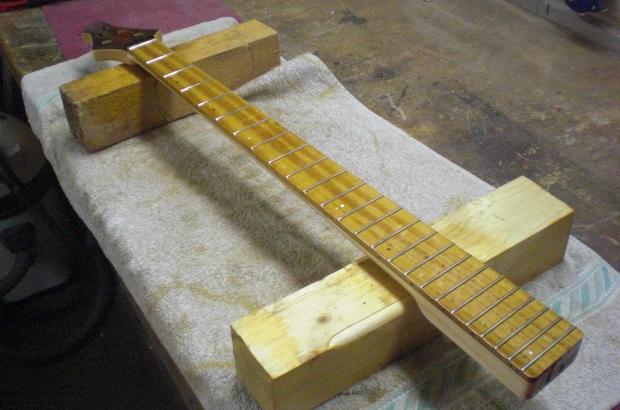 Dann kam endlich das Öl ins Spiel, genauer gesagt der Imprägniergrund, der vor dem eigentlichen Hartöl aufgetragen wird. Viel kann ich dazu nicht schreiben, außer vielleicht, dass der Ahorn am Hals am durstigsten war, die Nussdecke vom Korpus stand ihm aber nicht viel nach.