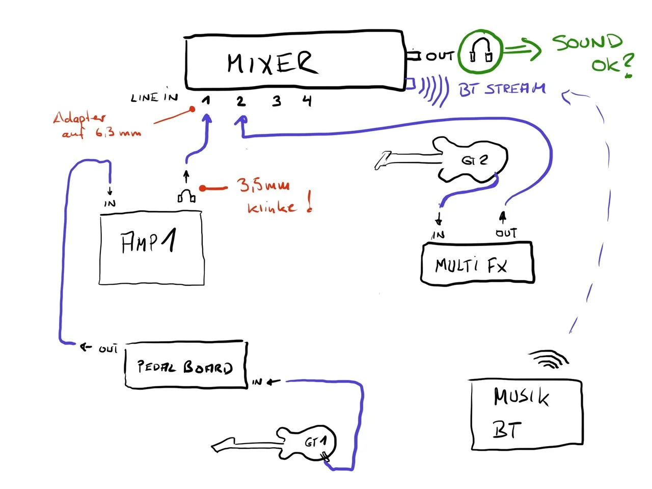 Ich habe einen AMP mit Pedal Board, aber auch ein MOOER GE300 Lite. Beides wird unabhängig genutzt. Und je nachdem welches Setup genutzt wird, erfordert das Anschließen der Kopfhörer und Aux-In Kabel. Das möchte ich nun mit einem Mixer lösen und gleichzeitig die Freiheit gewinnen, meine Musik per Bluetooth zu streamen.