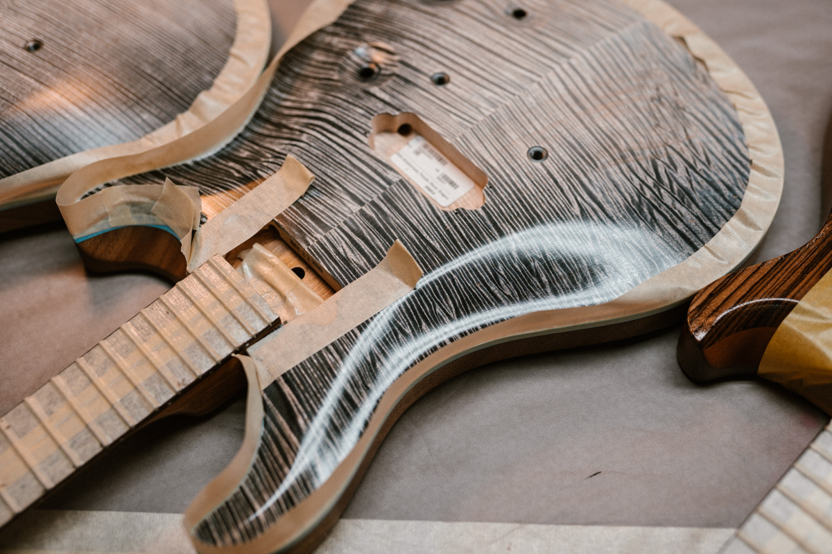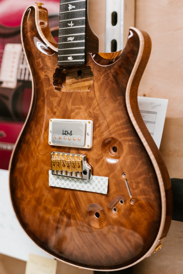 Ich finde den Vergleich interessant: Rechts ist eine Signature, Pauls erstes von ihm selbst so genanntes "Ultimate Grade"- Modell. Es wurde nahezu unverändert von 1986 bis 1991 gebaut, stammt also aus dem Beginn der (im Grunde fälschlicherweise) pre factory genannten Zeitperiode aus dem Standort Annapolis. Es spielt sich spürbar anders als moderne PRSi, weniger Les Paulig, weniger durchsetzungskräftig, aber sehr filigran, enormes Sustain, macht richtig Spaß. Sie packt einen erst, nachdem man sie eine Weile gespielt und sich an die ungewohnten Schaltungsoptionen und den sweet switch gewöhnt hat, dann aber umso heftiger.