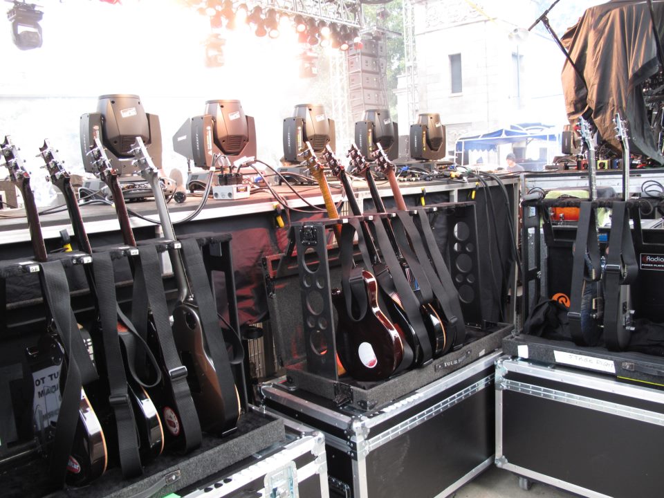 Vor allem ganz rechts in dem Gitarrenständer, da steht nämlich eine richtig geile Baritone Gitarre (die blaue).