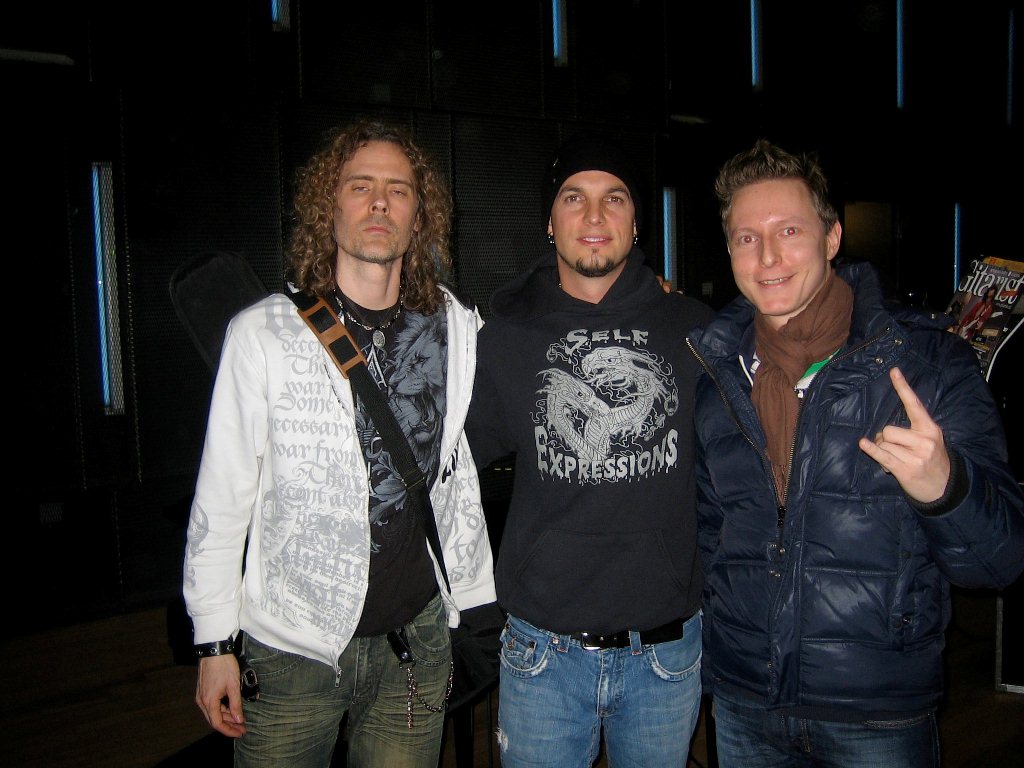 Und er ist in der Tat ein cooler Typ. Vor 2 jahren habe ich mal die Gelegenheit gehabt, mit ihm zu quatschen.* Er war bei einer Masterclass von seinem Freund Troy Stetina zu Gast, die der am Amsterdamer Konservatorium gab. Er hat sich halt dazu gesetzt und mit den Gitarre-Studenten gesprochen. Da ich leider schon seit lagem aus dem Studiumalter raus bin, hat mir ne Bekannte Zutritt verschafft. Er ist ein sehr zugänglicher Typ und hat sich für alle Leute Zeit genommen, die mit ihm sprechen wollten. Am nächsten Abend war Alter Bridge Konzert in Amsterdam, und das Treffen hat das doch noch etwas spezieller gemacht. Hier noch ein Foto auf dem Troy Stetina vergessen hatte, die Augen aufzumachen.