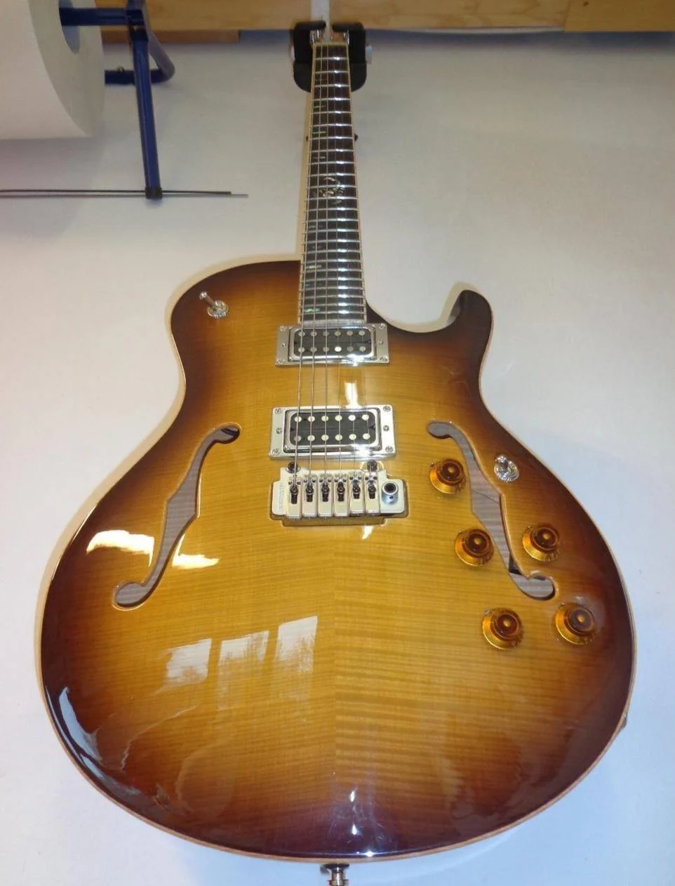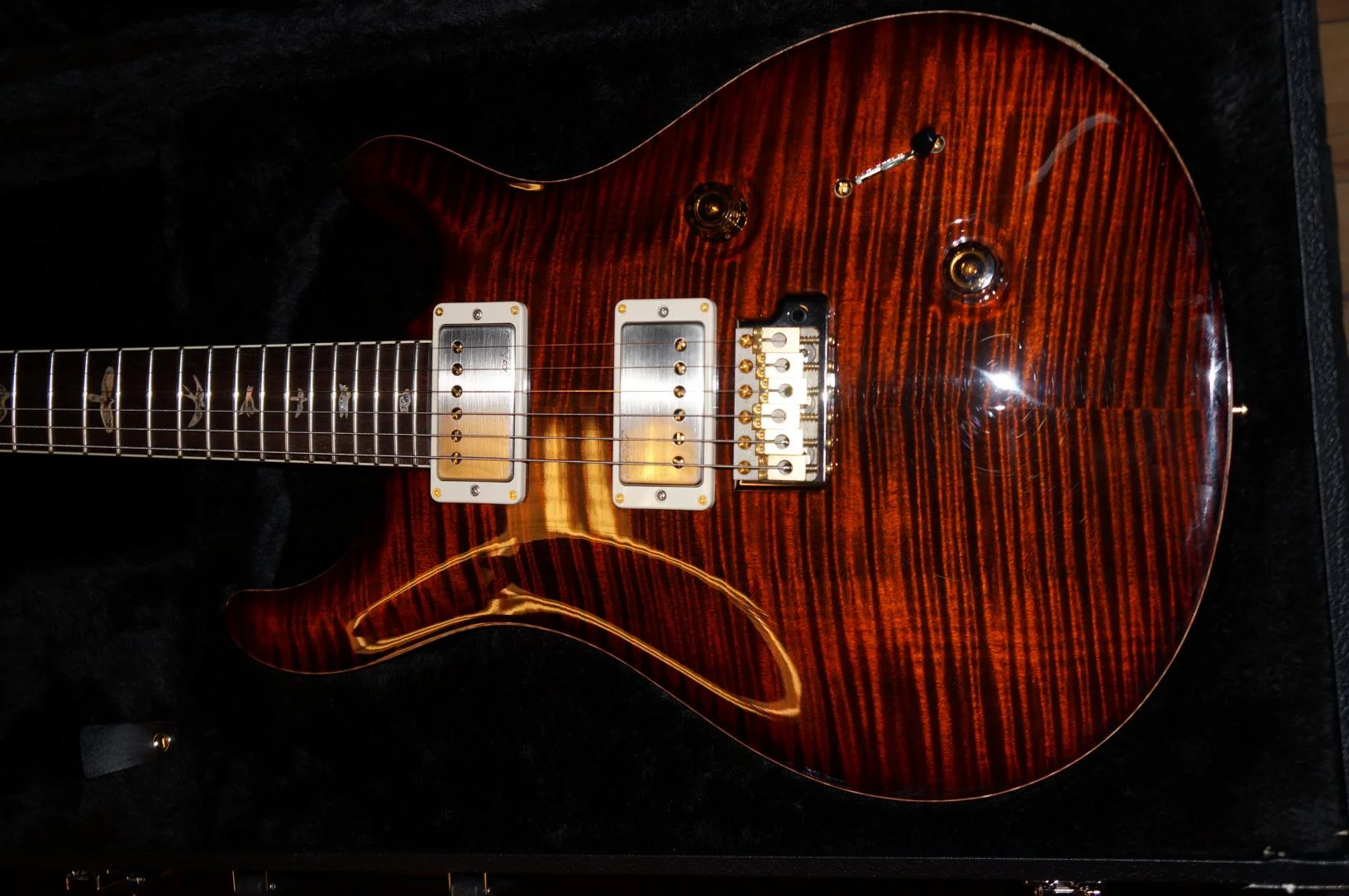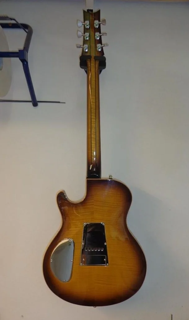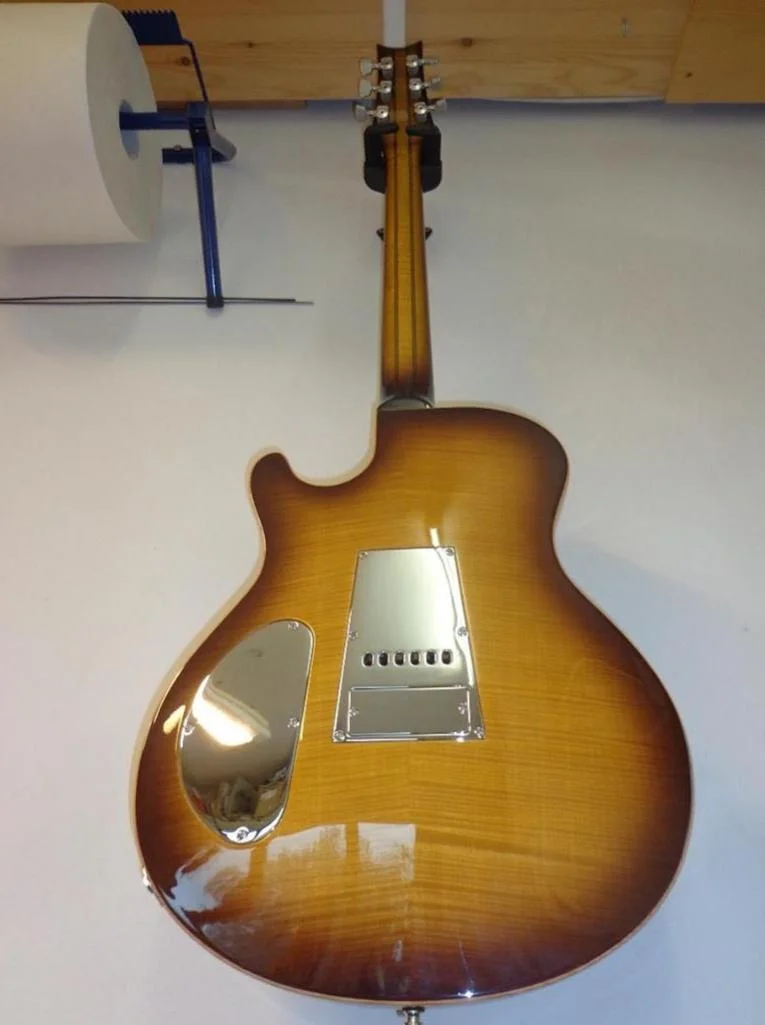 Wenn ich mir meine handgefertigte Amber so anschaue, frage ich mich natürlich, warum meine PRS bei dem Preis Plastikdeckel hat und auch die PUs nicht gerade ästhetisch verpackt sind (wie gut, dass das schwarze Plastik auf Black Gold nicht so auffällt). Dabei spart PRS durch reichlichen Gebrauch von CNC Fräßautomaten doch Geld ;-).