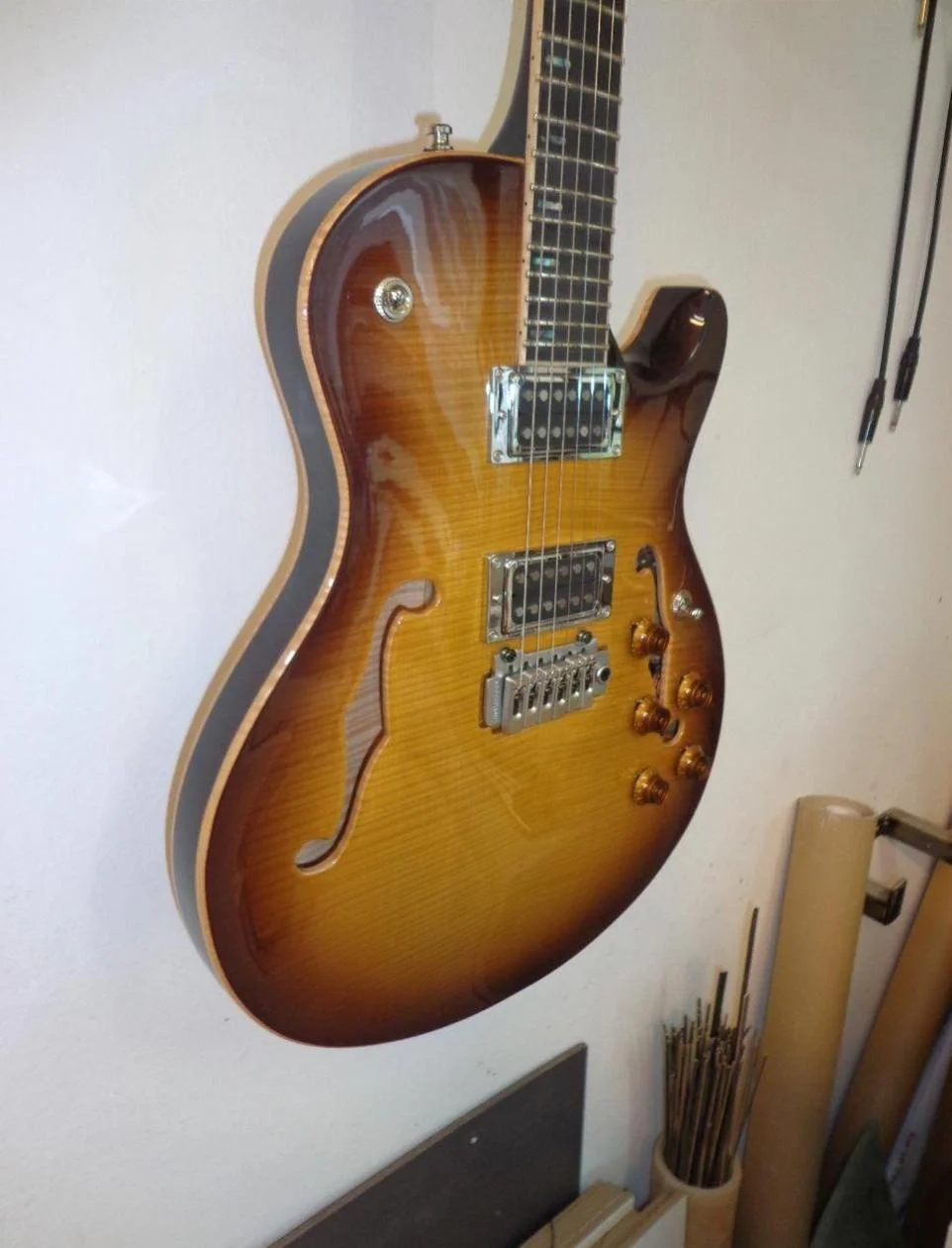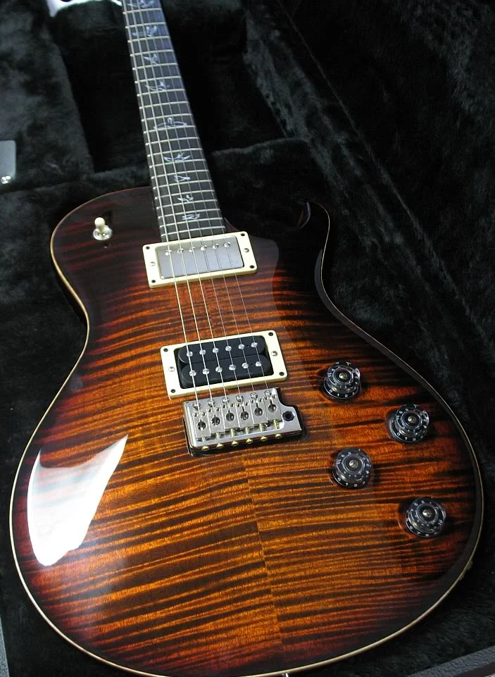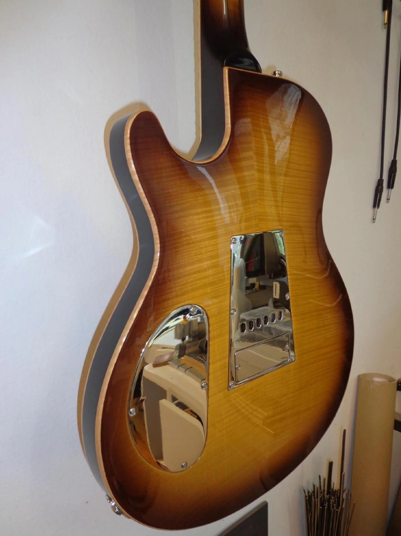Wenn ich mir meine handgefertigte Amber so anschaue, frage ich mich natürlich, warum meine PRS bei dem Preis Plastikdeckel hat und auch die PUs nicht gerade ästhetisch verpackt sind (wie gut, dass das schwarze Plastik auf Black Gold nicht so auffällt). Dabei spart PRS durch reichlichen Gebrauch von CNC Fräßautomaten doch Geld ;-).