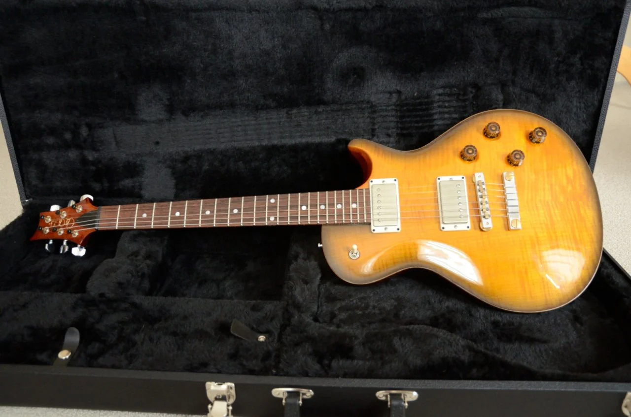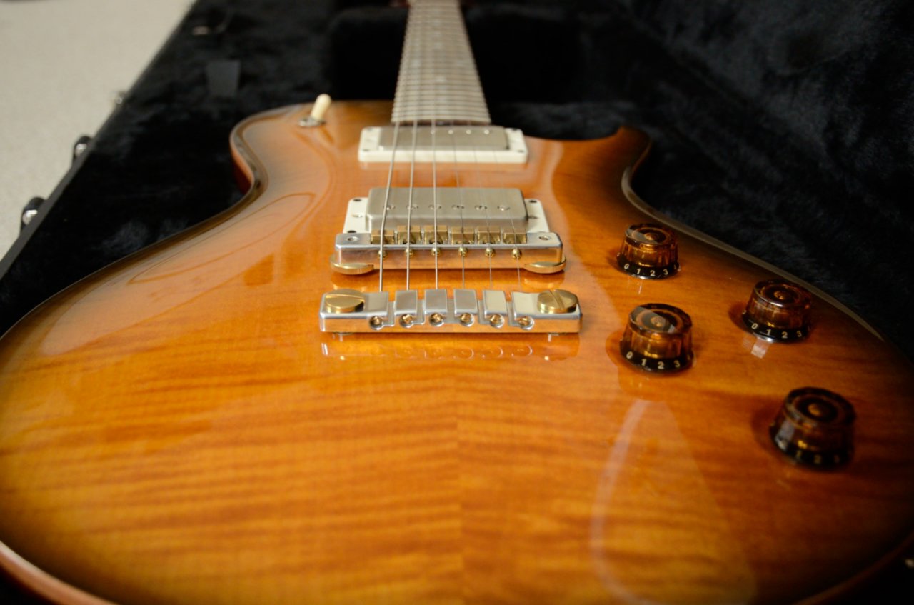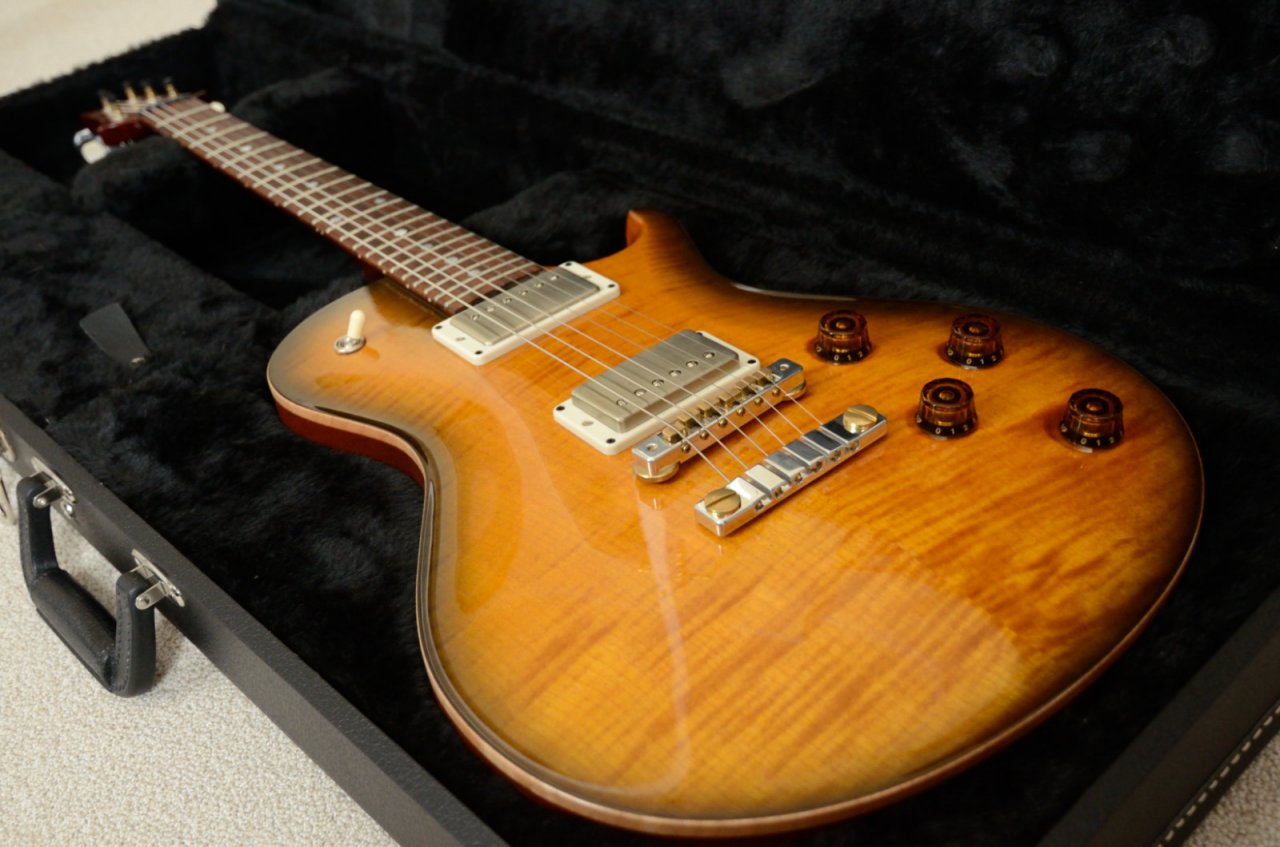 Ausgesucht habe ich sie vor 3 Wochen, als ich zu Besuch in Wien war. Ich wollte mich ja eigentlich von PRS etwas umorientieren und habe das Sound Forum besucht. Dort wurde ich sehr nett empfangen, man hat sich meine Wünsche und Vorstellungen angehört und dann gings auch schon ans Testen. Schecter USA Custom, FGN Les Paul - die FGN fand ich richtig gut. Dann wollte ich - sozusagen um mich noch einmal zu bestätigen - eine PRS im Vergleich spielen. Es hingen eine Tremonti und diese Stripped 58 an der Wand. Zuerst die Stripped - Wow - was ganz anderes, auf Anhieb habe ich mich mit dem eigentlich ungeliebten WideFat bzw. Pattern Regular Hals wohl gefühlt. Auch die 57/08, die ich in den Customs meines Bandkollegen bisher nur mäßig schätzte, passten perfekt ins Spielgefühl. Und die 24,5" - eigentlich wollte ich ja fast eher auf 25,5" - aber es hat einfach gepasst.
