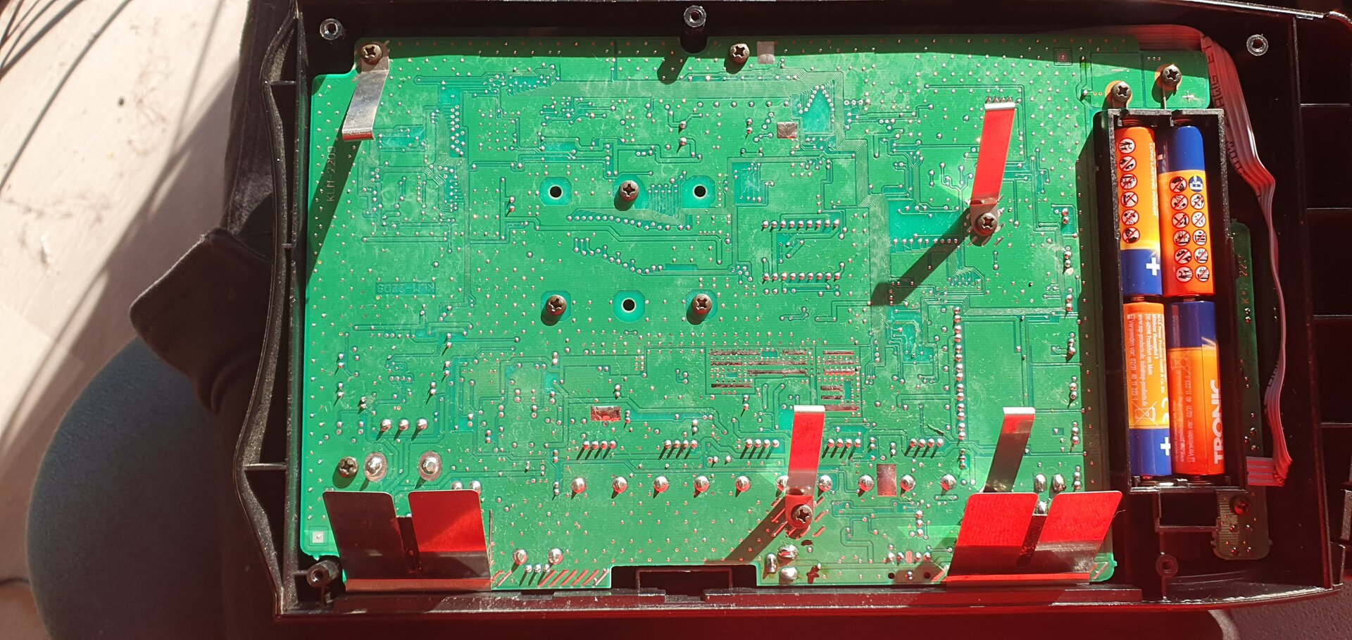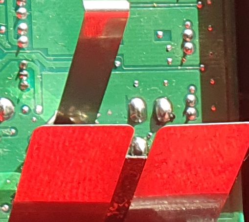 Vorsicht beim Hantieren mit der ausgebauten Platine an der Verlötung dieser 4-adrigen Leitung mit der Platine. Sie ist steif, steif angelötet, bricht bei zu viel Bewegung! Und die wieder anzulöten, ist ein nerviges Gefummel....