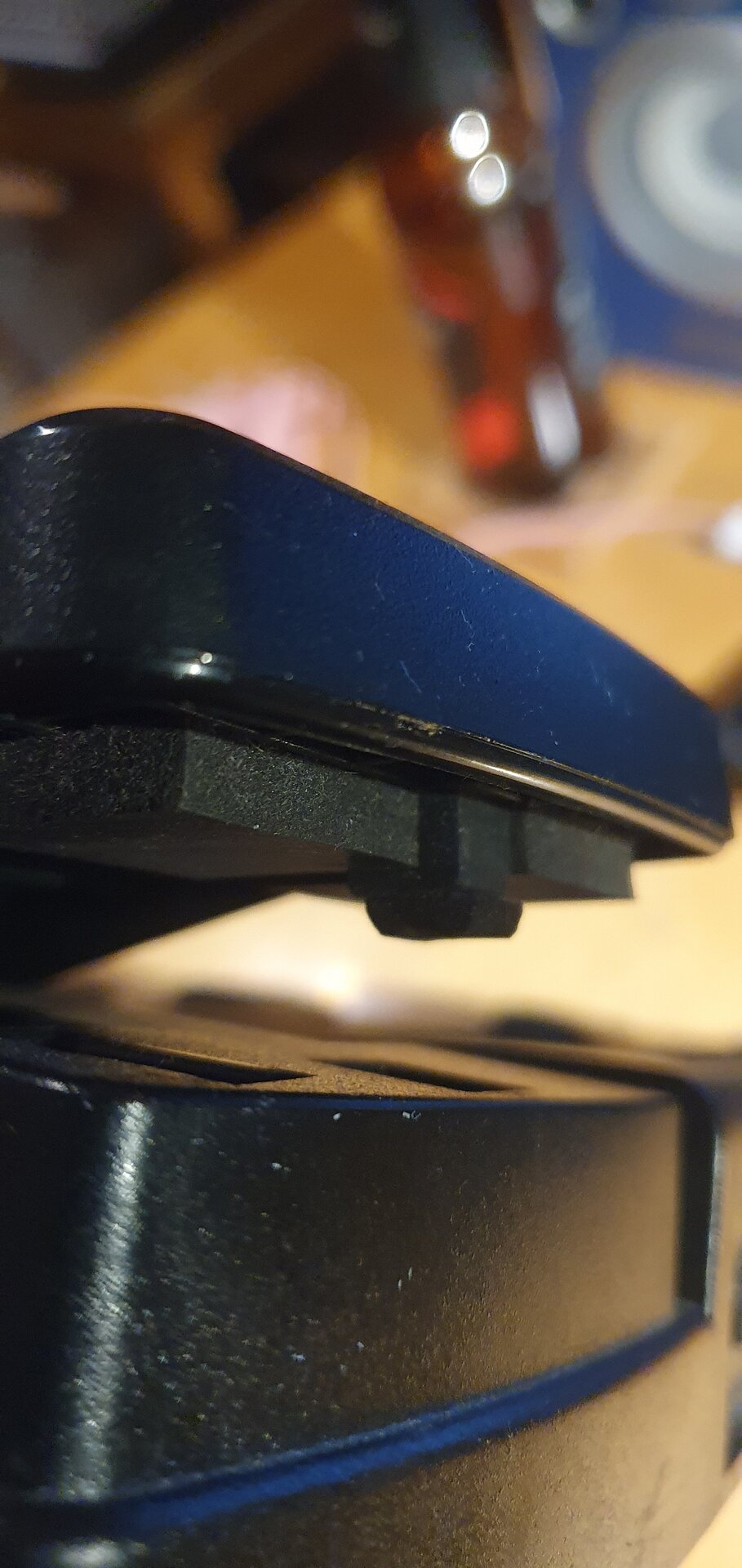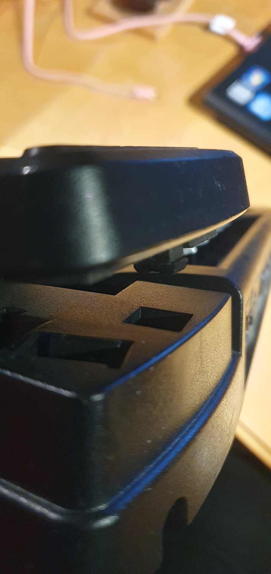 Zur Reparatur klebt man einfach ein dünnes Stückchen "Moosgummi" oder Möbel-Fuß-Gummi aus dem Baumarkt, passend zugeschnitten, unter den Betätigungs-Gummi-Block an der Unterseite vom Pedal, siehe 4. Foto.