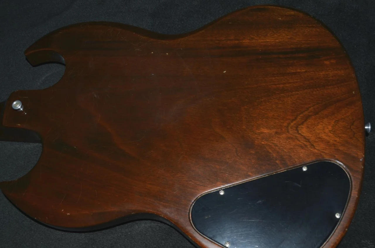 Korpus und Hals sind aus Mahagoni, der Hals ist verleimt. Der Korpus ist relativ dünn, wie bei SGs üblich, daher gibt es auch keine Hohlräume.