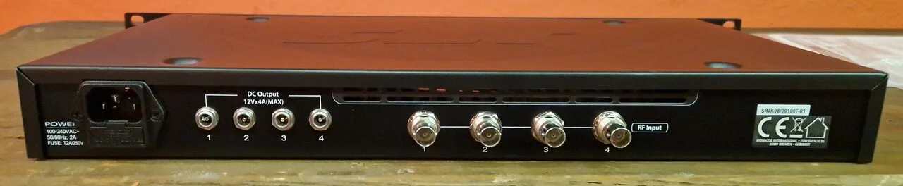 Auf der Rückseite wird es dann interessanter. Hier ist Links die Energiezuführung. Ein klassischer Kaltgeräteanschluss mit integrierter Glassicherung. Direkt daneben finden sich vier 12V Anschlüsse die 1A liefern können. Das reicht für die meisten Funkstrecken die angeschlossen werden sollen. In der Praxis funktioniert das wunderbar. Ich betreibe 2x "LD MEI1000" und 1x "Sennheiser XSW IEM" und denen reicht der Strom vollkommen aus.