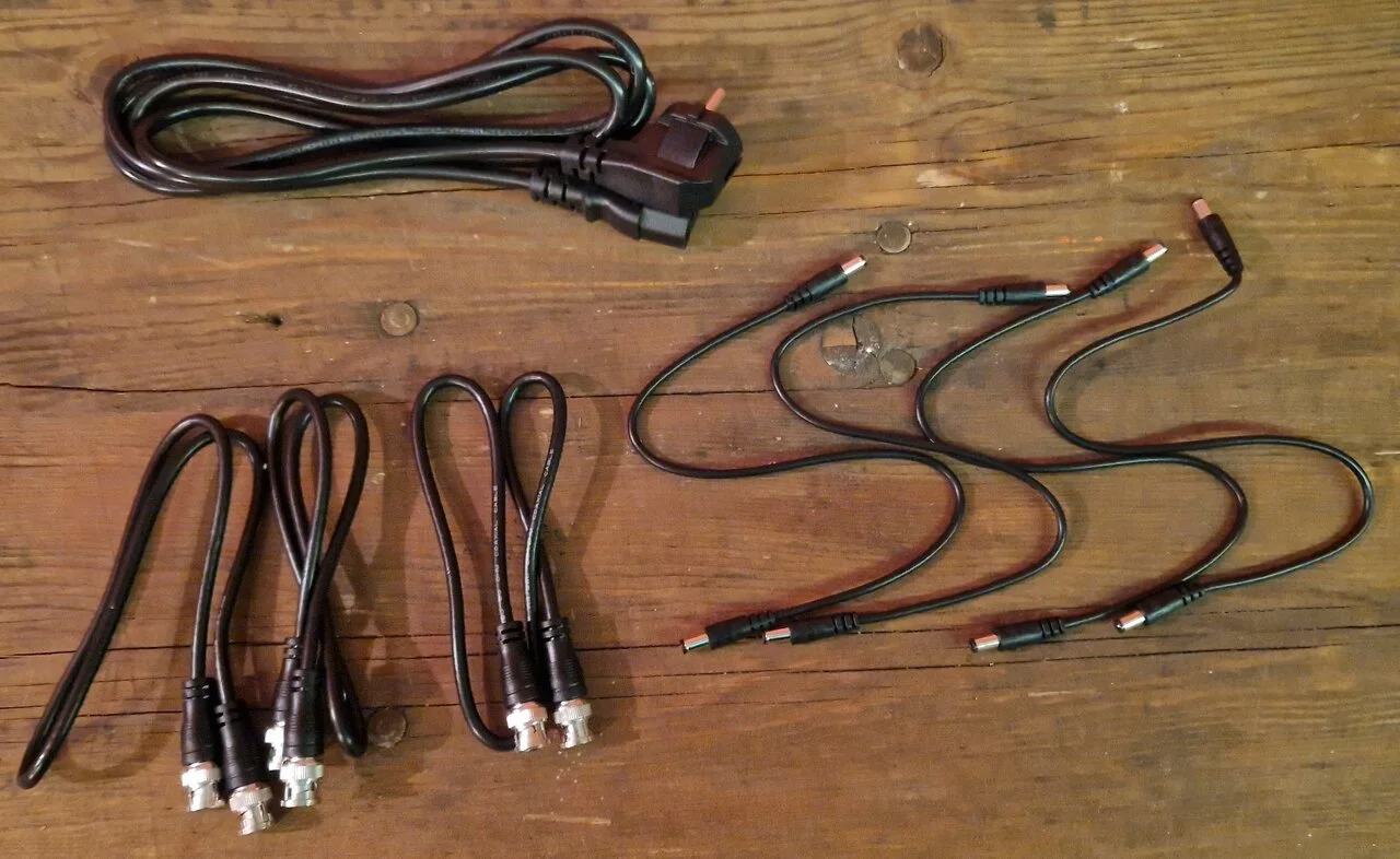 Zu guter Letzt sind noch Kabel dabei, die eine zusätzlich Bestellung überflüssig machen sollen. Natürlich ist ein Kaltgerätekabel dabei. Dazu kommen noch 4 BNC Antennenkabel die etwa 30cm lang sind. Damit kann man die Geräte in einem Case wunderbar verbinden. Außerdem sind noch vier etwa 25cm lange 5,5mm Hohlstecker-Kabel dabei (außen Minus innen Plus). Die haben bei mir einwandfrei gepasst.