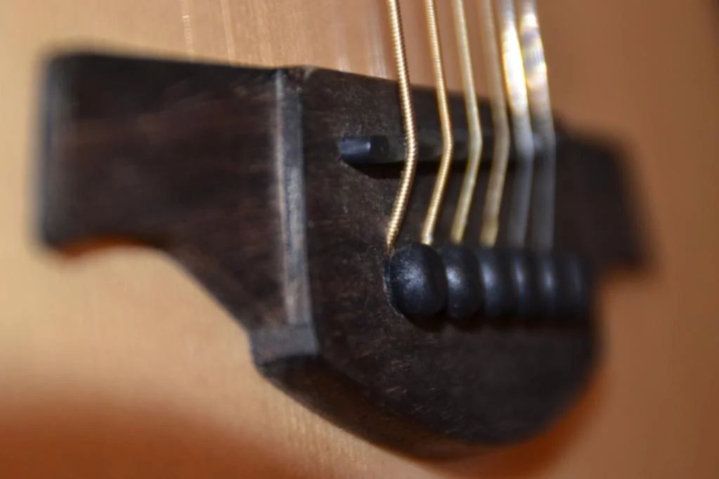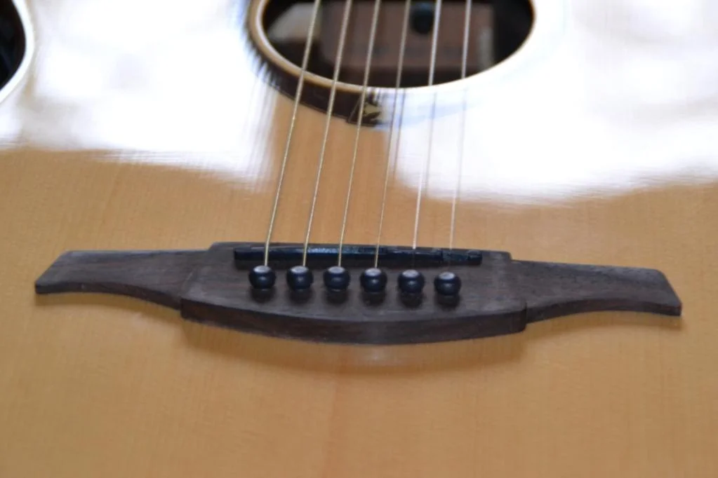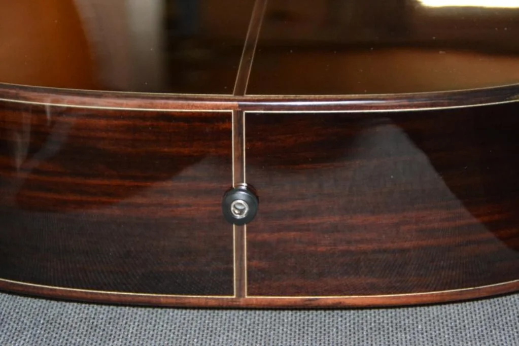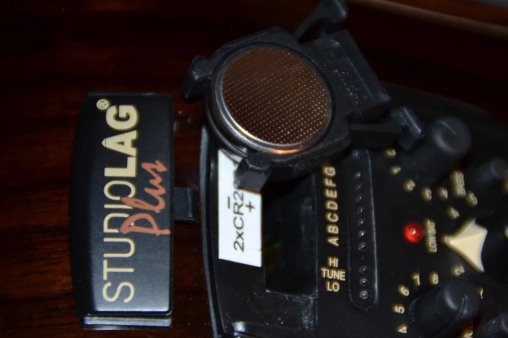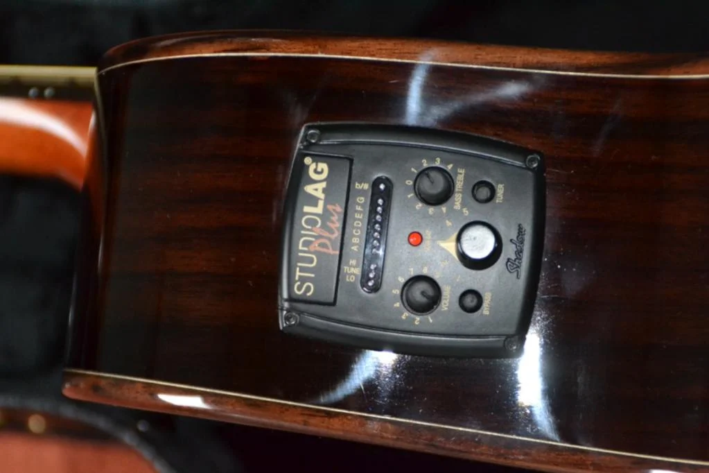 Der STUDIOLAG PLUS Vorverstärker mit seinen Presents ist perfekt angestimmt, kein langes nerviges drehen an den Reglern und der Nanoflex Piezo Pickup setzt jede Nuance des Spiels in wohlklingende Töne um. Ein Bass/Treble/Lautstärkeregler und ein chromatischer Tuner ist auch noch drin, was will man mehr. Gefüttert wird der Pickup mit Zwei Knopfzellen die etwas umständlich aus dem Batterieschacht herausgenommen werden müssen, falls die Energieträger mal schwächeln. Angestöpselt wird im Gurtpin, der Klinkenstecker sitzt bombenfest.