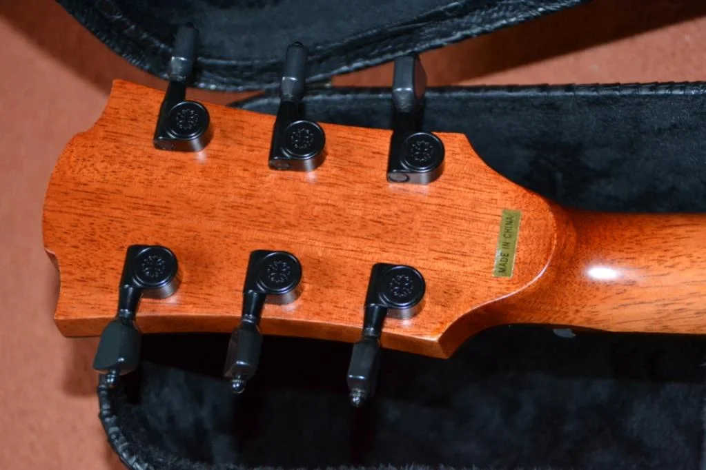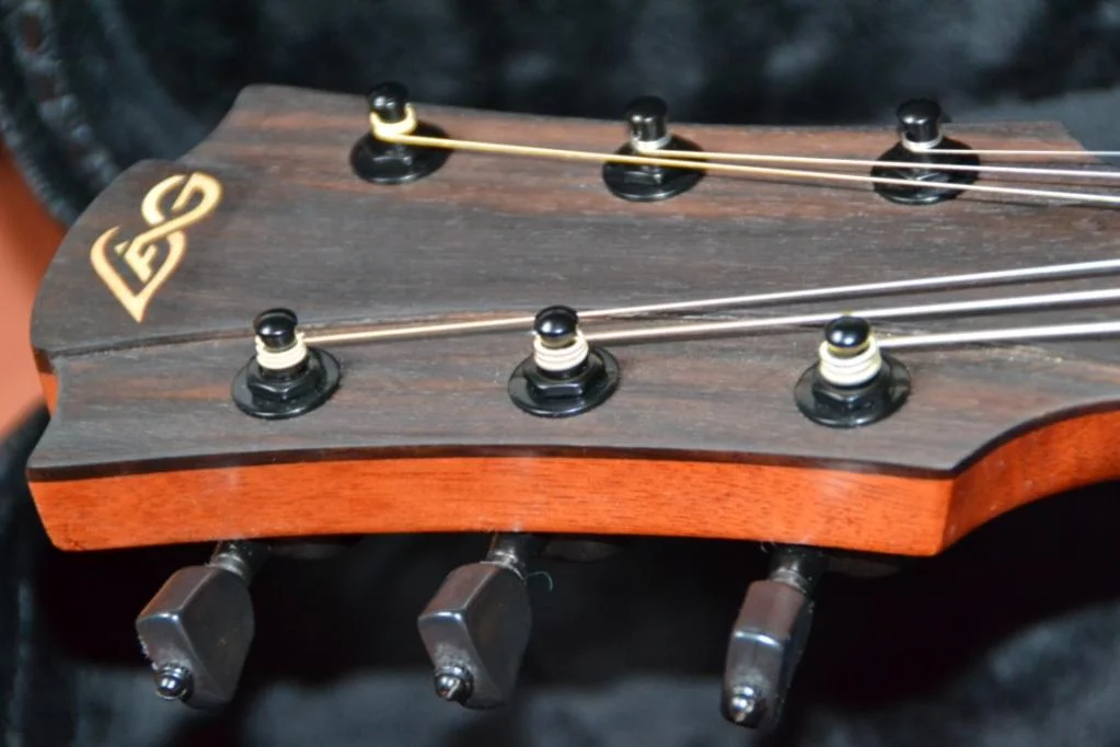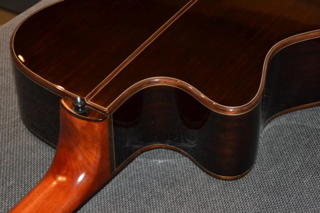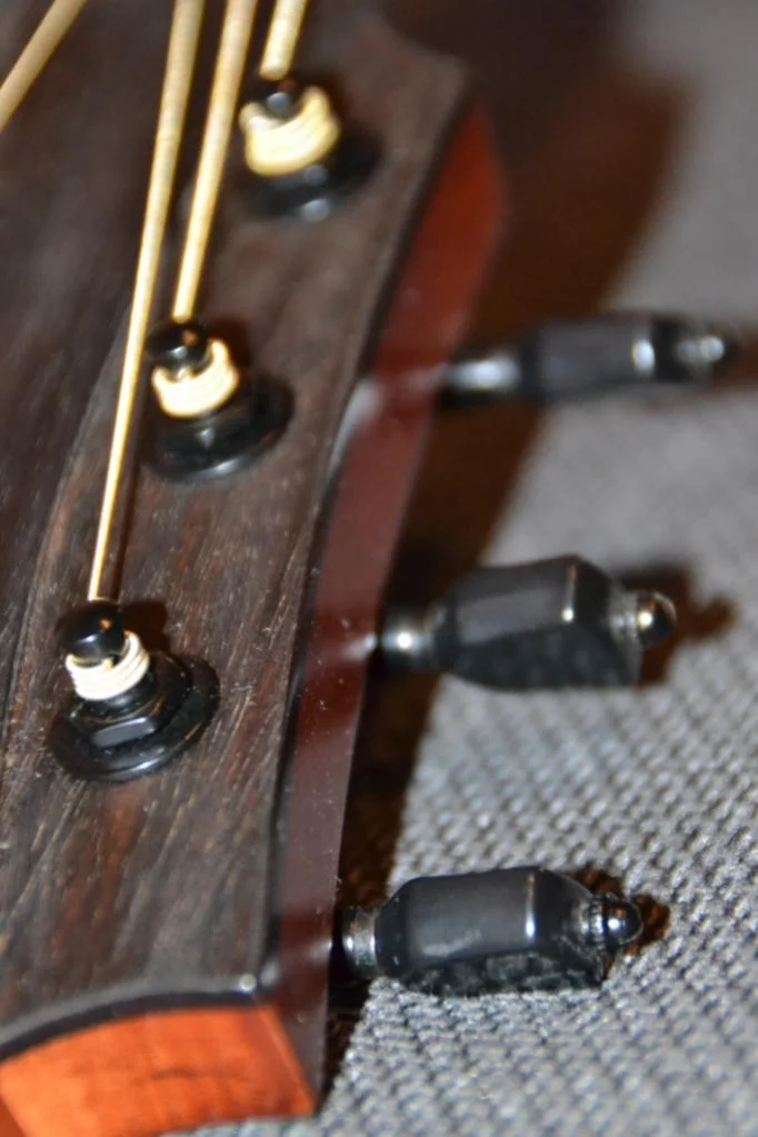 Der optisch superschöne Headstock hats mir gleich angetan. Dieses dunkle matte unbehandelte Holz mit den matt-schwarzen Mechaniken, Wow. Das dunkle Palisandergriffbrett ohne Inlays und der dunkle Graphitsattel passt optisch auch sehr gut zur Gitarre. Die Rückseite des Mahagonihalses hat ein schönes seidig-mattes Satinfinish. Der Boden und die Zargen aus hochglanzlackiertem massiven indonesischem Palisander sind sehr schön gemasert. Die Decke, ohne Pickguard, hat eine wunderschöne Maserung und ist aus selektierter massiver Sitka-Fichte, die Rosette ist aus Palisander und Ahorn mit Katharerkreuz. Dazu noch die traumhaften Bindings ich dachte nur, die geile Optik des ganzen springt dir ins Gesicht. Hätte ich fast vergessen, Top verarbeitete Gitarre und das ganze "Made in China"
