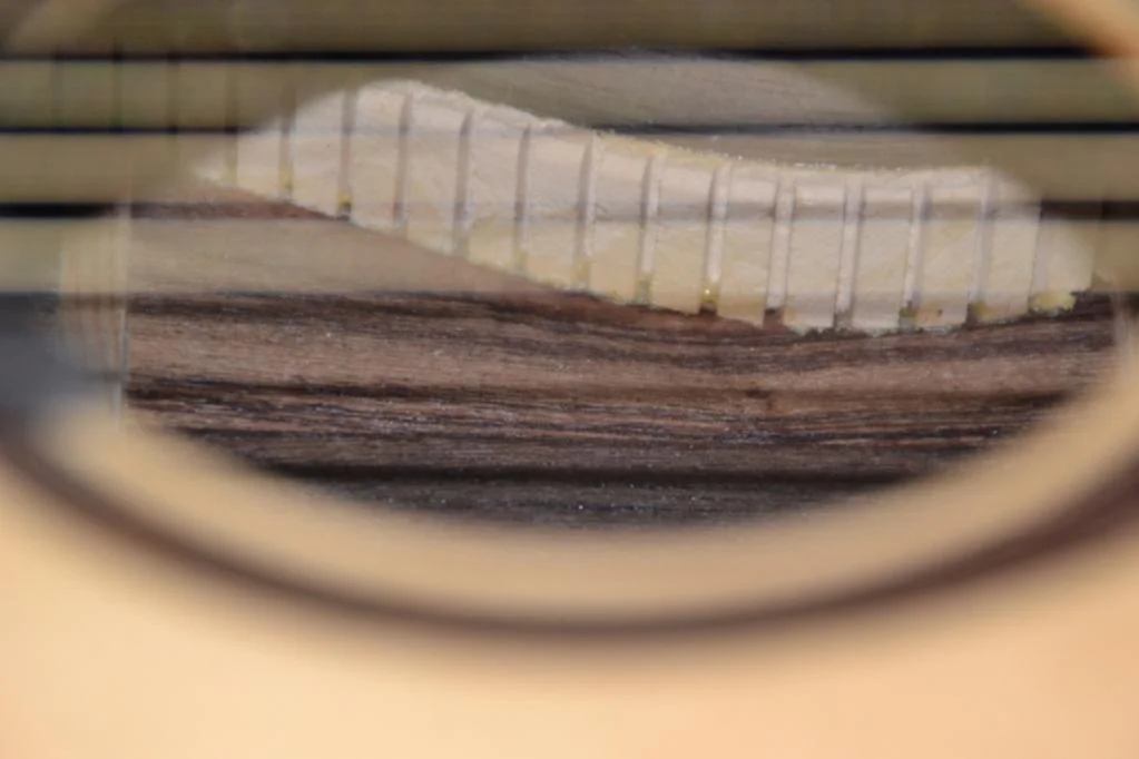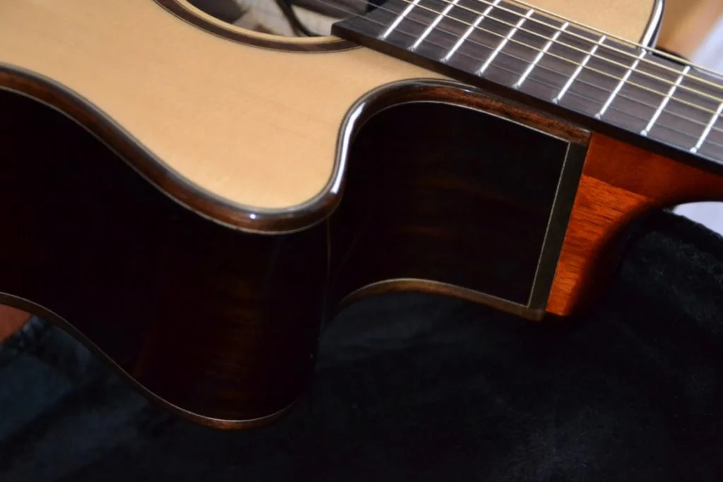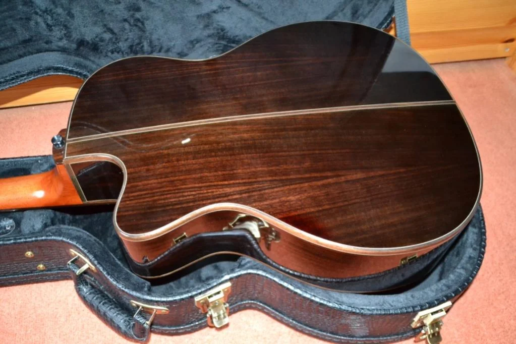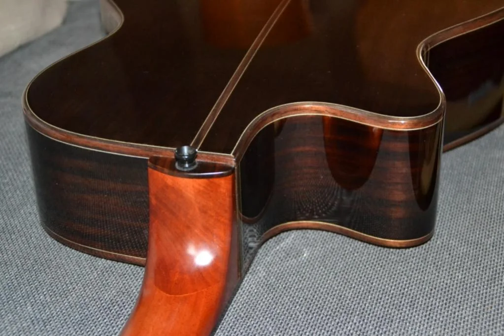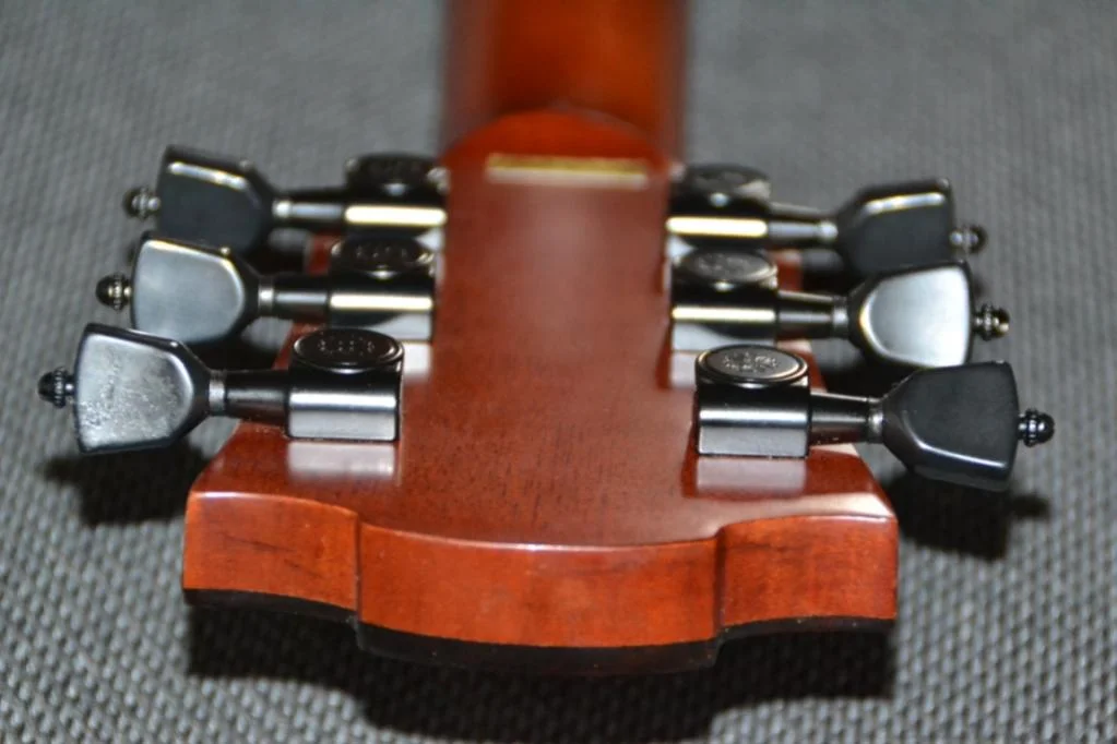 Der optisch superschöne Headstock hats mir gleich angetan. Dieses dunkle matte unbehandelte Holz mit den matt-schwarzen Mechaniken, Wow. Das dunkle Palisandergriffbrett ohne Inlays und der dunkle Graphitsattel passt optisch auch sehr gut zur Gitarre. Die Rückseite des Mahagonihalses hat ein schönes seidig-mattes Satinfinish. Der Boden und die Zargen aus hochglanzlackiertem massiven indonesischem Palisander sind sehr schön gemasert. Die Decke, ohne Pickguard, hat eine wunderschöne Maserung und ist aus selektierter massiver Sitka-Fichte, die Rosette ist aus Palisander und Ahorn mit Katharerkreuz. Dazu noch die traumhaften Bindings ich dachte nur, die geile Optik des ganzen springt dir ins Gesicht. Hätte ich fast vergessen, Top verarbeitete Gitarre und das ganze "Made in China"